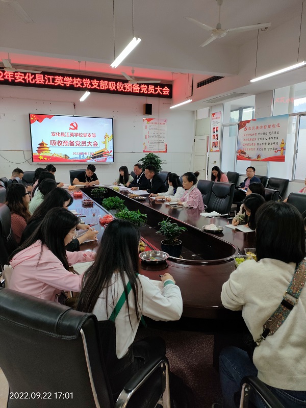 本网讯 9月22日下午4时45分,江英学校党支部在初中部五楼党员活动室召开2022年吸收预备党员大会,支部28名正式党员出席会议,4名预备党员列席会议,发展对象蒋海波同志参加会议。 大会由该校党支部书记谢豪主持,他对参会人员情况及相关要求进行说明后便正式进入会议议程。 在大会上,发展对象蒋海波同志首先作自我介绍并宣读了《入党志愿书》,他满怀深情地畅谈了对党的深刻认识,表达了对党的一片赤诚和要求加入党组织的迫切心情。两位介绍人分别发了言,介绍了蒋海波的思想、学习、工作情况,用事实讲述了他的优秀。受党支部的委托,由党建专干王光明宣布了对蒋海波的政审情况,认为他政治历史清楚,执纪执法部门联审合格,现实表现优秀。全体党员踊跃在讨论会上发言,从不同的侧面,充分肯定了蒋海波的成绩,纷纷盛赞他是一位名副其实的优秀骨干教师。 最后大会用无记名投票方式进行表决:28名党员一致赞成同意吸收蒋海波同志为中共预备党员,全场顿时响起了热烈祝贺的掌声!