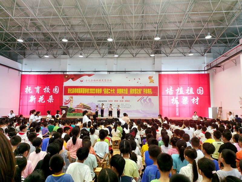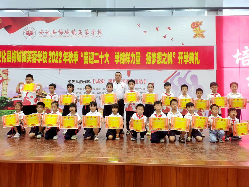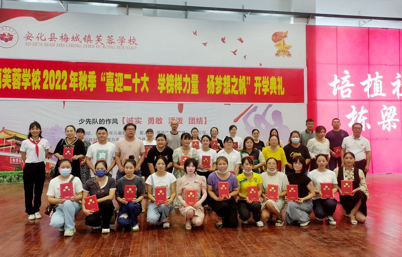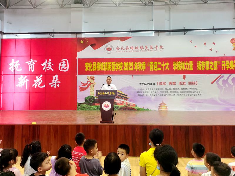 本网迅 9月9日上午,安化县梅城镇芙蓉学校举行2022年秋季“喜迎二十大 学榜样力量 扬梦想之帆”开学典礼,804名学生、48位教师及36名家长志愿者参与了本次活动。 “请全体肃立,奏唱国歌”,在响亮的国歌声中,开学典礼正式拉开了帷幕。典礼上,校长王吉阶寄予新学期。他希望同学们把握现在,不断磨砺、充实、提升自己,才能未来有为。芙蓉好少年的颁奖仪式中,教导主任李碧林宣布了2022年上学期教育教学成绩表彰名单;政教主任蒋志和宣布了2022年上期优秀班干部名单、广播站电视台优秀主持人名单并颁奖,公布了2022年下期学生会干部名单,为38位家长志愿者颁发聘书。德育处杨林娟老师组织同学们进行了具体详细的入学教育。最后,学生代表芙蓉二班刘涵予在发言中,向同学们揭秘自己成长为新时代好少年的秘诀,鼓励同学们只要努力、勤勉、自制、积极向上,总有一天自己会成长为照亮别人的光。 “一代人有一代人的使命,一代人有一代人的担当”。未来之责任,不在他人,而全在我少年。相信芙蓉学子会用自己的实际行动,在最美的校园里绽放出少年最美的风采!用自己的实际行动,追求卓越,一路向上。
