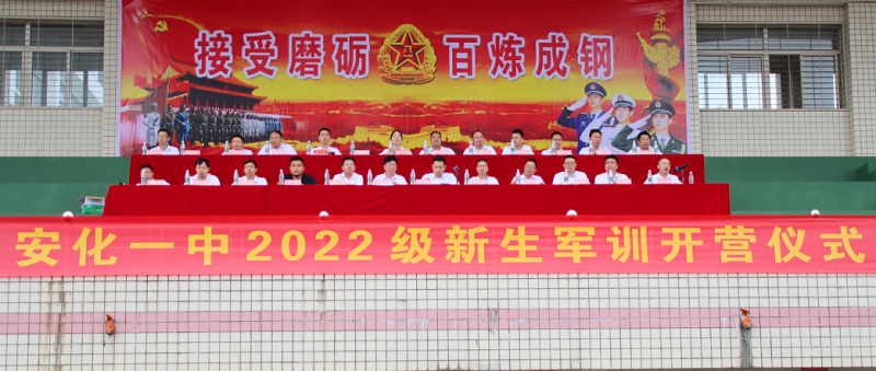 本网讯 8月24号上午八点,安化一中2022级新生军训开营仪式在田径运动场举行,学校全体行政人员出席本次活动。仪式由学生工作办公室主任肖剑主持。