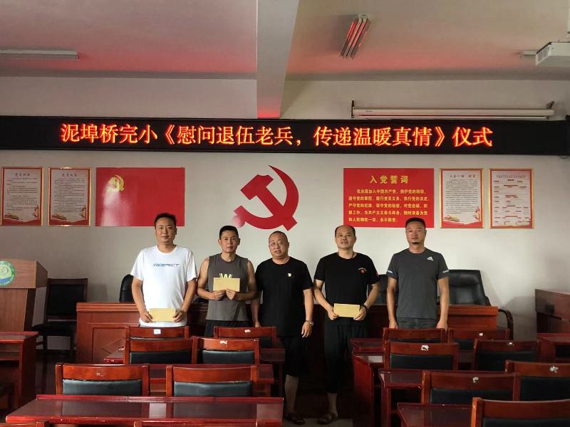 本网讯 8月1日上午9点,东坪镇泥埠桥完小举行了“慰问退伍老兵 传递温暖真情”座谈会。 泥埠桥完小校长蒋军主持召开座谈会,指出:学校的四位老兵曾经是英勇的人民解放军军人,现在是光荣的人民教师,无论什么身份,本色不变。年轻时保卫祖国,退伍后在学校平凡的工作岗位上兢兢业业、努力工作,一直保持着军人的本色。蒋军对四位退伍老兵表示亲切慰问,并合影留念。 老师们在微信群中纷纷向兵哥哥们发出节日的祝贺,祝贺语、表情包、鲜花……满满的,表达的是快乐,传递的是真情!四位兵哥哥很开心,表示生活在这样的集体特别温暖,一定会努力工作,不负党的培养,人民的期待!(通讯员 姚放元)
