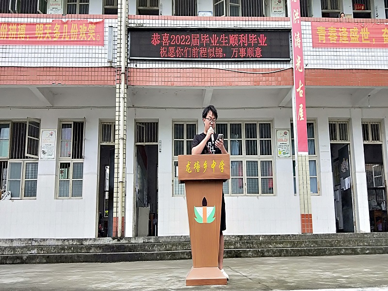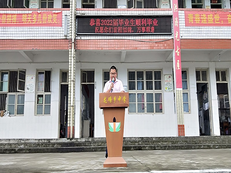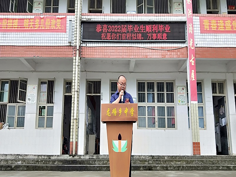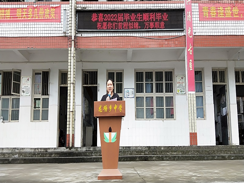 中考结束后,龙塘镇中学组织九年级毕业班学生进行了简短的毕业典礼。仪式分为四个流程:一、教科室主任致欢送词;二、班主任代表赠言;三、校长寄语;四、教导处主任宣布全体毕业生毕业。