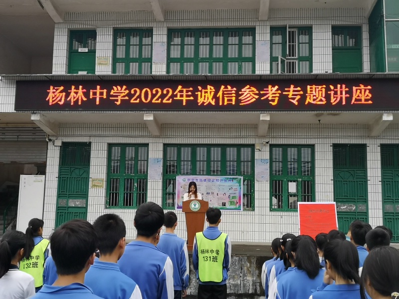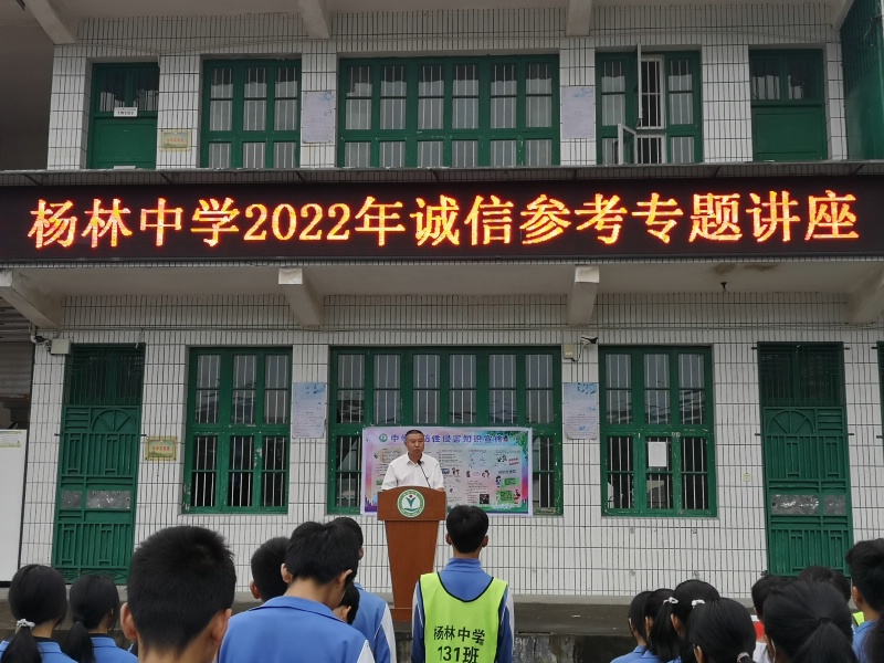 本网讯 6月13日早晨,杨林中学举行了“我诚信 我成功”2022年诚信参考专题讲座暨诚信参考宣誓仪式。八、九年级247名考生及相关老师参与了此次活动。 校长谌更生做了诚信参考的专题报告,他用鲜活的事例证明诚信不仅是一个国家、一个社会、一个民族生存的必备条件,也是维系人际关系的精神纽带和人际关系的最高准则,诚信是道德建设的根本。诚实守信,作为中华民族的传统美德,理应代代传承,理应在我们扬中学子身上得到更明显的表现。他强调了益阳市教育局今年对诚信参考、诚信做人提出的更严格的要求和对考试违纪舞弊者做出的更严厉的处罚规定。告诫同学们一定要诚信参考、诚信做人,并明确提出四点要求:管理好自己的手机;清理好自己参考的必需品;配合做好安检;做好疫情防控,着同色、同款衣服不得超过3人。他祝愿所有学生能考出自己理想的成绩,祝愿2022年中考取得圆满成功! 教务主任黄紫星组织学习了《益阳市初中学业水平考试考务工作手册》第八章违规处理中的《考生违纪舞弊处理规定》,并带领全体考生进行诚信参考宣誓。(通讯员:欧阳跃科)
