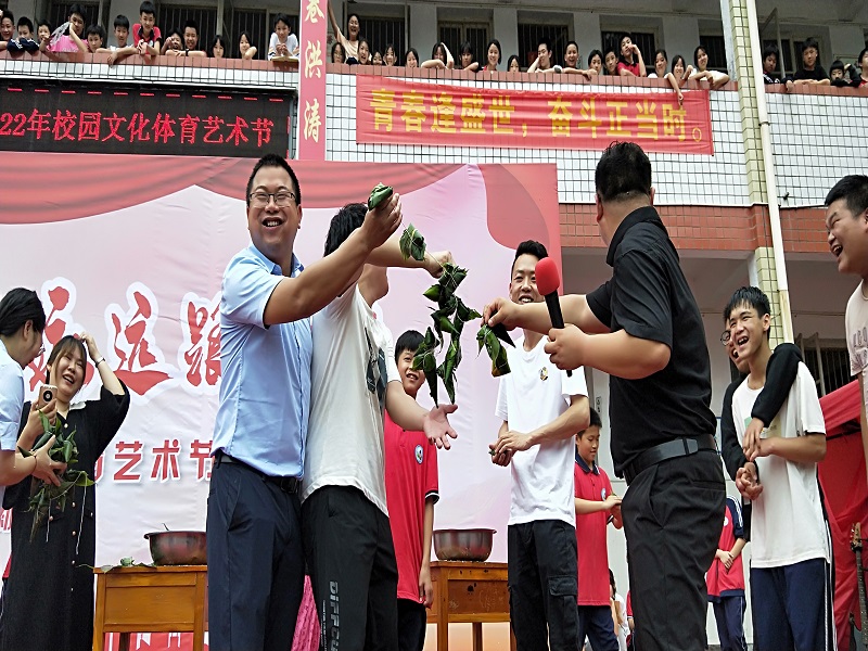 本次艺术节活动形式新颖,丰富多样:上午有篮球PK赛、棋艺大比拼、系列知识竞赛、师生包粽子比赛等,只见老师和同学们赛前严阵以待,赛后欢呼雀跃,校园里回荡着阵阵一浪高过一浪的叫好声与喝彩声。最吸引人眼球的还是下午的文艺表演,当专业乐队演奏的开场音乐响起,全体师生就一直乐得合不拢嘴:诗朗诵倾情出演、小品轻松幽默、器乐组乐声悠扬、表演唱个性十足、舞蹈活力四射、创意表演诙谐有趣……全体师生不时眉开眼笑,不时尽情鼓掌。最后,教师乐队的激情演绎把整个活动推向了高潮,全体师生在意犹未尽中依依不舍地离开。