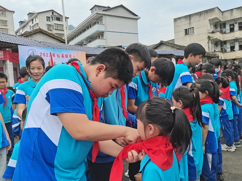 本网讯 5月31日下午,仙溪镇完小在学校操场隆重举行新队员入队仪式, 200名新队员光荣加入中国少年先锋队。 仪式在学校少年宫鼓号、啦啦操等社团精彩的表演中拉开了帷幕。辅导员郑重宣读了少先队员名单,200名孩子经少先队大队委员会审核决定,成为中国少年先锋队队员.老少先队员们为新队员带上鲜艳的红领巾,新队员们高举右手,在队旗下庄严宣誓。新队员代表付梓璇,老队员代表姚晨稀分别进行了发言,队员表达了对少先队的向往,并表示用实际行动为红领巾增光添彩。少先队大队辅导员刘晨老师带领全体少先队员呼号,呼号声响彻整个校园。伴随着庄重的退旗曲,光荣而神圣的新队员入队仪式圆满结束。 此次入队仪式不仅增强了少先队员的光荣感的自豪感,同时也展示了新时期我校少先队员乐观、积极和向上的精神风貌。(通讯员 周艳红)