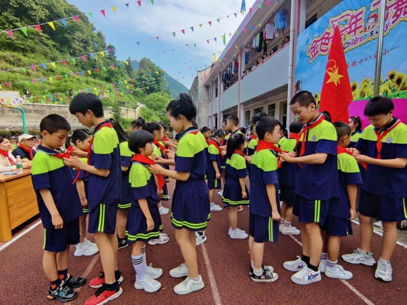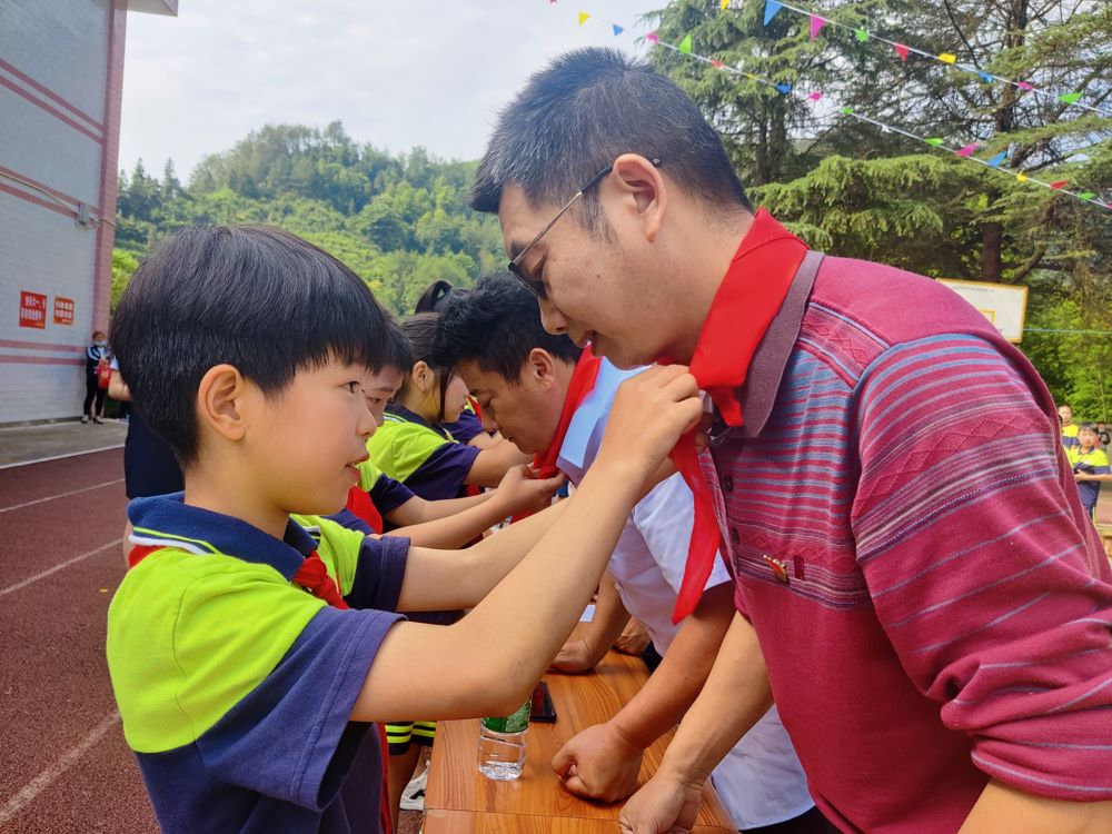 庄重的入队仪式,鲜红的队旗迎风飘扬,嘹亮的队歌响彻四方。在队旗的见证下,高年级的少先队员代表们为新队员佩戴红领巾。他们郑重地将崭新的红领巾佩戴在新队员的胸前,并互敬队礼。16名新队员向着队旗庄严宣誓,立下坚定的信念。此时此刻,飘扬在胸前的红领巾,不仅是少先队员光荣身份的象征,更是引领着新队员不断前行的火炬!