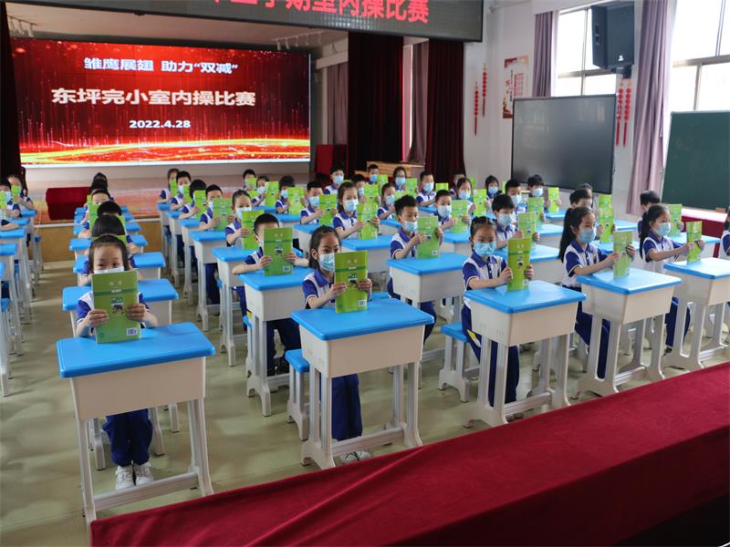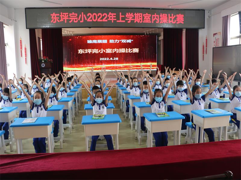 本网讯 4月28日—29日,东坪完小室内操比赛在六楼多功能厅举行,该校1-5年级42个班2300余名学生参加。 上午10点,随着欢快的室内操音乐响起,比赛准时开始!参赛队员们在班主任的带领下统一着装,精神抖擞地迈进比赛场地。做操时动作整齐优美,节奏准确,气势十足,赢得了评委老师的阵阵掌声。 据了解,这是该校为配合疫情防控需要,增强学生体质,实现五育并举的又一举措。该校党支部书记、校长陈秀丽安排德育副校长黄飞翔带领艺体老师精心编排,多次修改,反复打磨,形成了一套科学合理、符合小学生身心健康的全新室内操。 本套操分文、武、德三个篇章,彰显学校特色:诵立志经典,展东风少年志高远,显学校传统文化特色;武《精忠报国》,展东风少年精气神,显学校武术经典特色;舞《听我说》,展东风少年好习惯,显学校养成教育特色。 比赛结束后,班主任蒋师耘高兴地说:“这套室内操实在是太棒了!不但让学生们感受到了运动的快乐,还引导学生树立高远志向,养成良好习惯!”(通讯员 谌学智 陈秀丽)