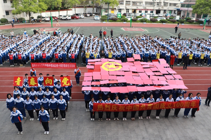 举行隆重的升国旗仪式之后,进行“告别童年,唱响青春”14岁集体生日活动。该校党支部委员、分管教学副校长刘卫安发表青春寄语。全体同学齐唱《生日歌》,共许生日愿。部分同学将事先准备好的心型心愿卡贴到许愿墙上,电视里同步播放同学14岁生日的心愿心声,无不令人憧憬,令人振奋。该校八名年轻团员教师、各年级学生、团员学生合作齐颂了共产主义先驱——李大钊同志的《青春》。 入团仪式环节,该校党支部书记、校长刘志慧宣读了学校党支部决定书,同意接纳140名共产主义青年团员。新、老团员集体宣读了入团誓词;新老团员代表分别发言;该校党支部副书记、副校长谢立贤在大会上讲话,对团员同学提出了新的要求,并寄予了殷切希望。