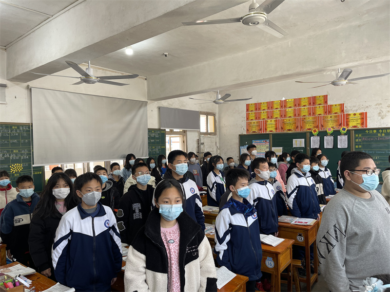 本网讯 3月28日上午,大福镇中学取消室外集会升旗仪式,改为班级室内升旗仪式,鼓励并推动学生积极参与爱国卫生运动,增强学生疫情防控意识。 上午10点20分,随着嘹亮的国歌奏响,教室里的学生、班主任及办公室的老师们全体肃立,面向升旗台的方向投以庄重的注目礼。随后,该校政教处主任蒋益葵进行国旗下讲话,他对近期疫情反复下,老师们、同学们对学校防疫工作的大力支持表示感谢。强调近期学校严格执行错峰用餐、坚持“防疫三件套”、牢记“防护五还要”。同时,他表示三月是学雷锋月,同学们要弘扬雷锋精神,培育家国情怀,践行“请党放心,强国有我”的青春誓言。要甘于奉献,勇敢担当,树立正确的价值观,自觉将个人理想追求融入党和国家事业发展,做社会主义合格建设者和可靠接班人。 升旗仪式,加深了同学们对雷锋精神真谛的认识,鼓舞了同学们传承和弘扬雷锋精神的热情和决心,纷纷表示要在学习和生活中践行雷锋精神,以实际行动做雷锋式的好青年。本次升旗仪式还增强了全体师生的个人防护意识和战胜疫情的信心与决心,同时也见证了大福镇中学学子追求卓越之心,更激励全体师生不惧艰难,坚定地奔向美好未来!(通讯员:龚佳玲)