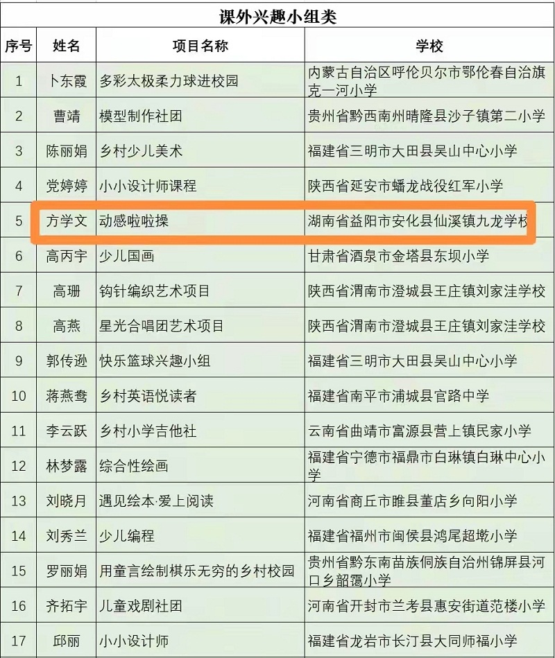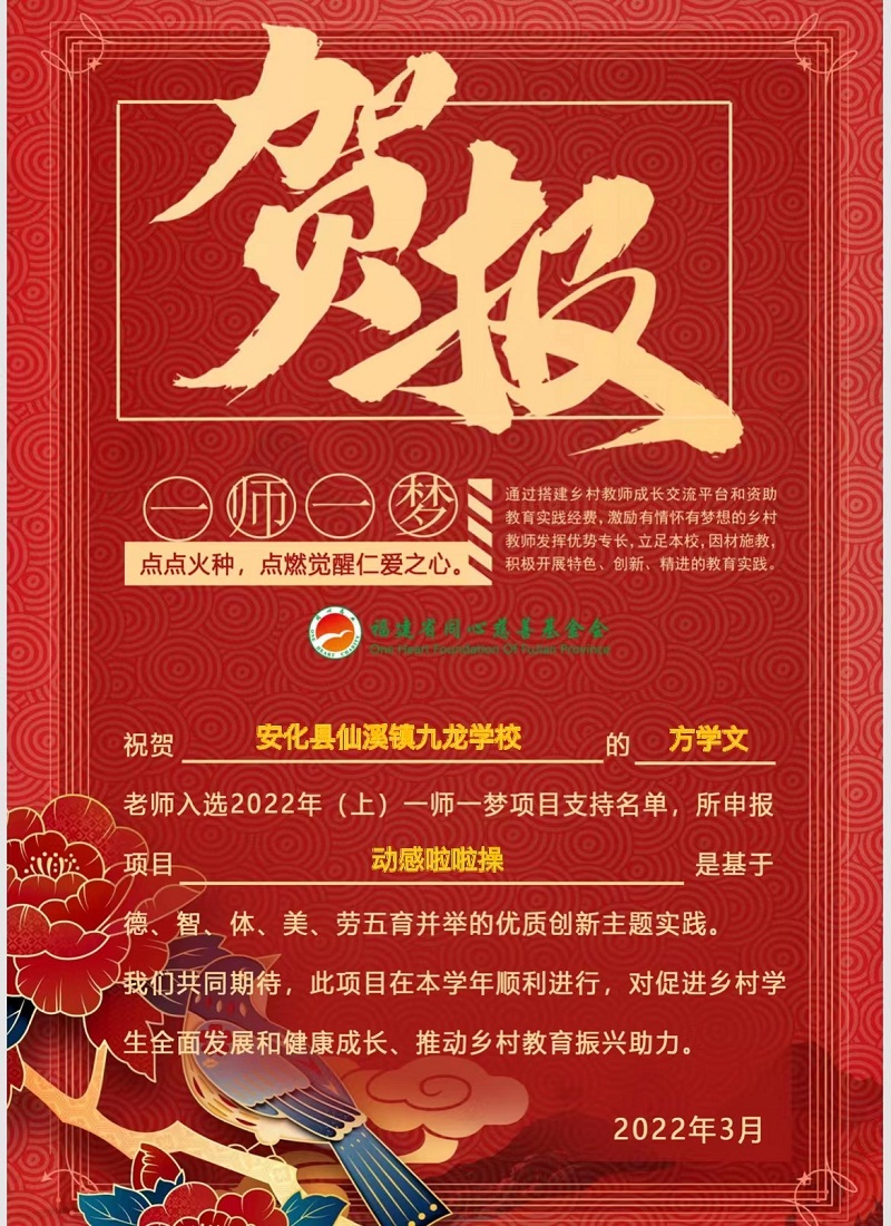 本网讯 3月23日,由福建省同心慈善基金会发起的公益项目“火种计划·一师一梦”公布了2022年首期资助的100个梦想,仙溪镇九龙学校方学文老师撰写的《动感啦啦操》项目成功入选本次课外兴趣小组类。方学文将每年获得5000元项目支持资金,其中80%资金用于教师实践项目;15%资金用于项目组对乡村教师的培训费用、项目走访费用等;其余5%用于项目组管理费用。