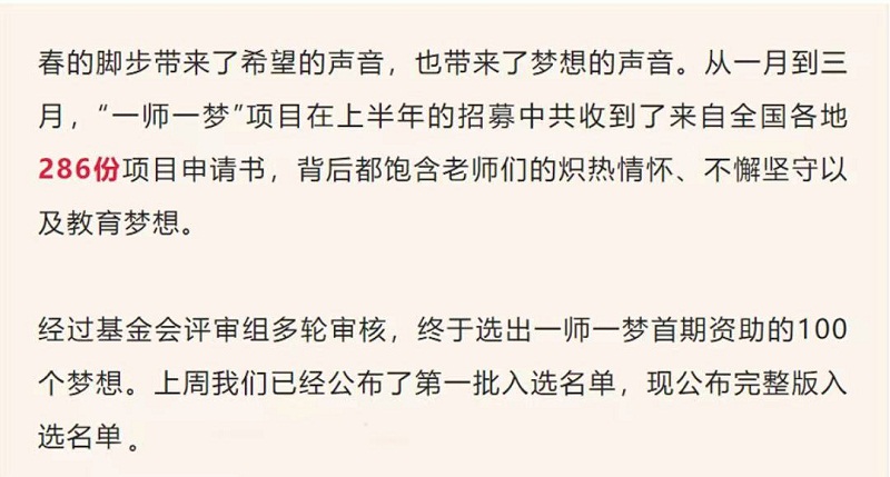 “火种计划·一师一梦”是支持乡村教师学习成长与教育实践的公益项目。支持对象为义务教育阶段乡村中小学,任教满1年的专职老师。通过搭建乡村教师互动交流的平台和资助教育实践经费,激励有情怀有梦想的乡村教师发挥优势专长,立足本校、因地制宜、因材施教,积极开展特色、创新、精进的教育实践,并倡导社会力量共同关注和支持乡村教育,让乡村孩子也能享有优质教育,从而促进乡村学生全面发展和健康成长,进而推动乡村教育的振兴发展。