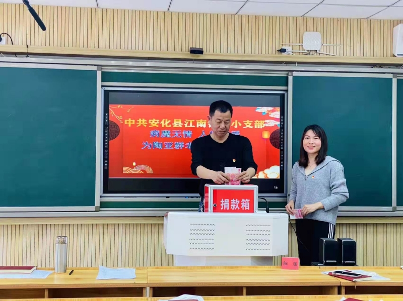 本网讯 “病魔无情,人间有爱,感谢江南镇完小全体教职工的爱心捐助”,江南镇中心学校副校长王震在代表陶亚群老师接受捐助时说道。 据了解,本次捐助活动是江南镇完小党支部积极响应江南镇中心学校党总支发起的《帮帮陶亚群老师倡议书》而组织开展的。陶亚群系江南镇洞市中学英语教师,今年2月2日突发疾病入安化县人民医院救治,2月8日转入中南大学湘雅医院ICU抢救,目前已花费30多万,后期还需高额治疗费用。为解决陶亚群的燃眉之急,江南镇中心学校党总支倡议所辖各园、校教职工为之募捐。3月16日,江南镇完小支部召开专题会议,并向全体教职工发出倡议,倡议发出后,教职工积极响应,踊跃捐款,一笔笔凝聚着爱意和真心的善款不断汇集,短一个小时就筹得善款 7650元。 该校支书贺剑伟表示:“一方有难,八方支援”是我们的传统美德,“赠人玫瑰,手有余香”是我们的文化传承,他人有难,我们必将尽微薄之力,用爱心激励他们战胜困难。(通讯员 刘红军)