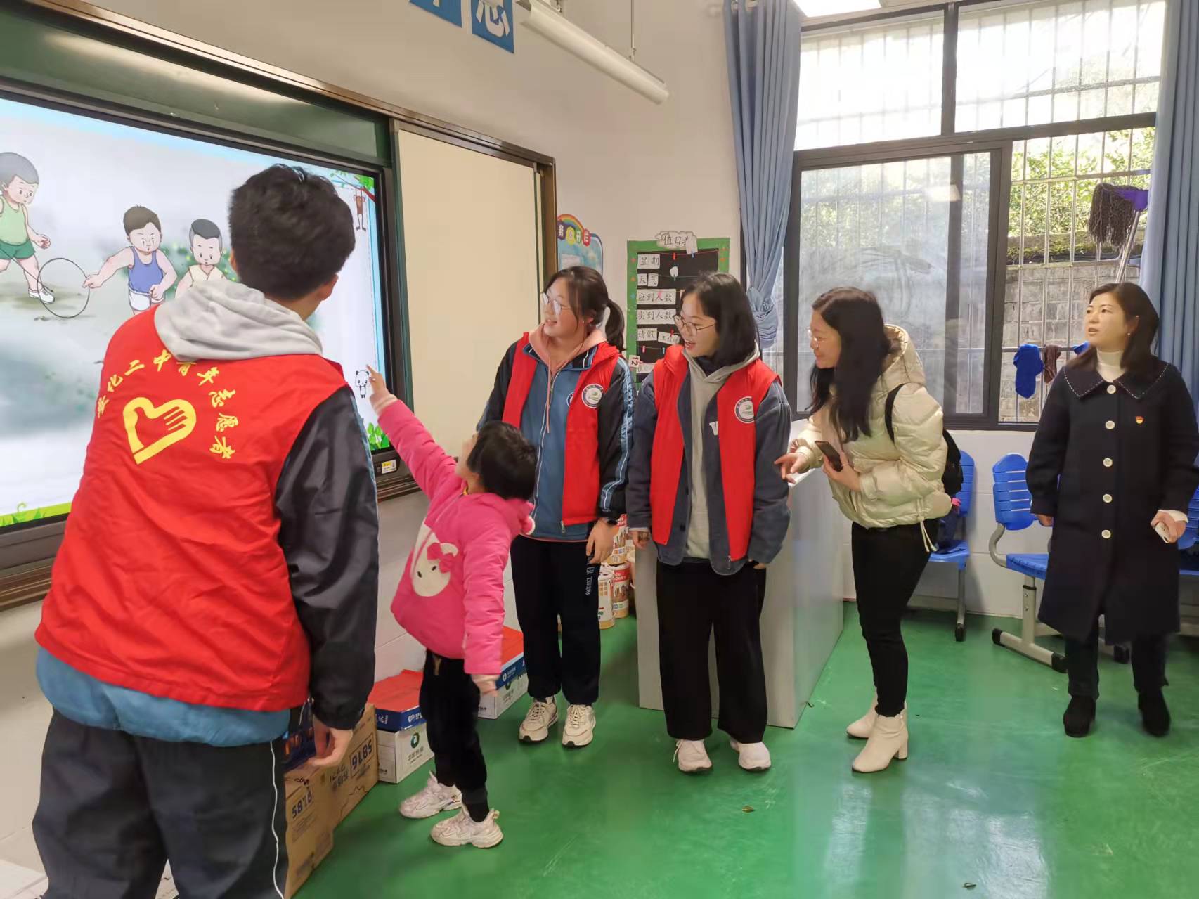 二中师生对本次社会实践活动进行了精心的策划与组织,为特校的同学们准备了看图说故事、识字游戏等精彩活动内容,牛奶、水果、面包等食物,以及一批图书和儿童绘本。到达特殊教育学校后,志愿者们排队依次进入教室和小朋友们打招呼,特校的孩子们热情欢迎哥哥姐姐们的到来。