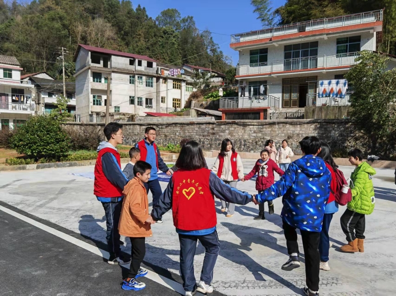 室内课堂活动结束后,志愿者们带领小朋友们在室外操场集合,手拉手围成几个大圆圈,学唱歌曲《你笑起来真好看》。温暖的阳光照耀着志愿者和孩子们,愉悦的歌声与笑声回荡在操场。