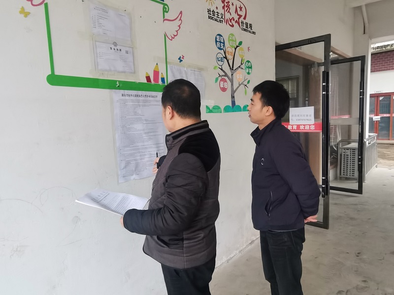 本网讯 雪后初融,春意渐浓,新学期已正式拉开序幕。2月23 日,马路镇中心学校责任督学伍玉华一行三人对辖区内的所有校外培训机构进行了督查。 在湘仁教育培训校区,各兴趣特长班还没正式开始培训。中心学校负责安全的副校长邓云彪对校区进行了全面巡查,强调开班前要落实好疫情防控、校园隐患排查工作,开班后要加强交通、消防安全管理,加强家长与学校联系,对学生动向及时、准确掌握。伍玉华指着张贴的《湖南省校外培训机构禁止性事项负面清单》,对负责人夏浪涛说:“你要组织全体教师、学生、家长学习清单,你们公司要认真领会精神、落实具体要求。”随后,一行人巡查了马路镇另一个取得办学资质的鲲鹏教育学校,同时指出要100%与培训学生家长签订合同,费用收缴公开且上交到规定平台。 伍玉华还实地或电话走访了美术、器乐等小型培训机构,全面掌握情况,同时通告未取得资质的培训都属于非法行为,将上报政府相关部门,必须停办。 通过本次工作督查,为规范、净化校外培训机构市场打好新学期“第一枪”,能更有利促进“双减”工作的落实。