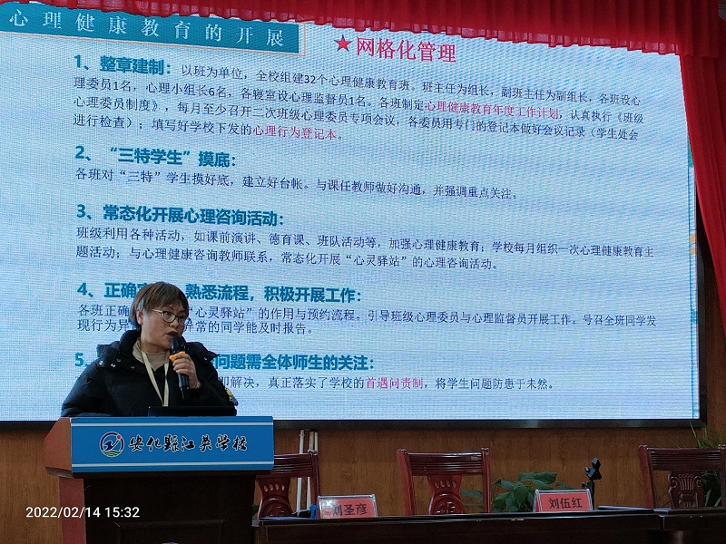 本网讯 2月14日上午9点,江英学校2022年寒假教师学习班开班开讲。在安全教育培训会议上,该校中学部学生处主任谭红霞在安全培训专题讲座中强调指出2022的安全工作要突出抓好三项重点工作。 一是心理健康教育的开展。要整章建制,以班为单位,全校组建32个心理健康教育班,每班设心理委员1名,心理小组长6名,各寝室设心理监督员1名;要搞好“三特学生”(三特:特殊心理、特殊体质、特殊困难)的摸底,建好台账;要常态化开展心理咨询活动,充分发挥“心灵驿站”的作用。呼吁学生心理健康问题需要全体师生的关注,使心理健康问题防患于未然。 二是校园欺凌的防患。谭红霞从校园欺凌的种类、教育学生勇敢地向校园欺凌宣战、要机制灵活地处理校园欺凌、教育学生慎重交友等方面进行了宣讲。 三是“疫情”防控的落实。进入校园戴口罩;开学前21天的健康登记卡;入学前对学生做好摸排工作,填好相应表格;搞好消毒杀菌;尤其关注中、高风险返安人员;按照要求接种新冠疫苗等,这些工作一定要坚决落实。 落实“首遇问责制”与“一岗双责”,时刻绷紧安全工作这根弦!全体教师受到了一次系统的安全教育,人人明确了安全教育“三重点”。(通讯员 王光明)
