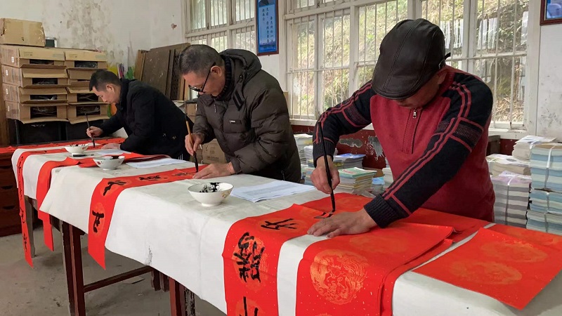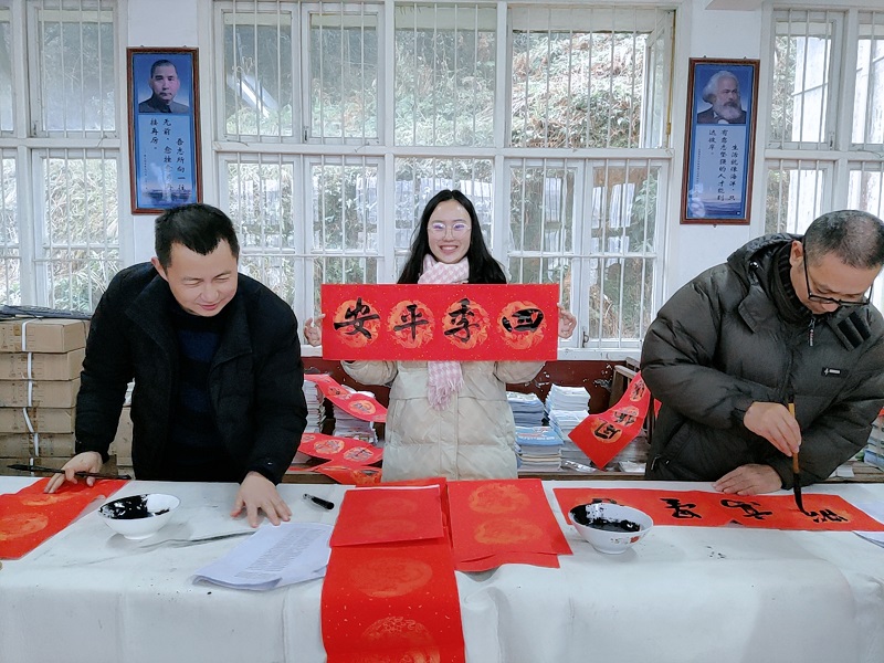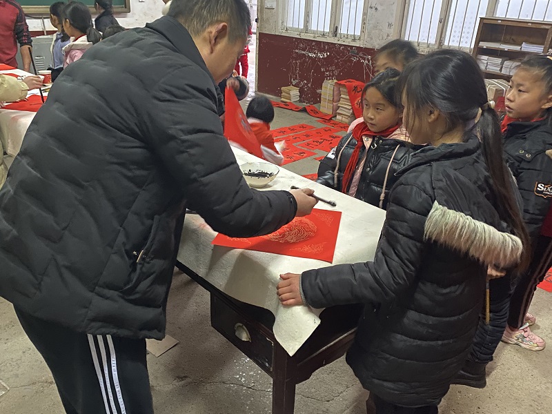 本网讯 2022年1月4日,安化县书法家协会副主席王立龙、秘书长王翔赴羊角塘镇金鸡完小现场书写春联。师生蜂拥而至,一边欣赏,一边挑选自己中意的对联,纸韵墨香飘校园,好一派热闹非凡的场景。(通讯员 龚庆香)