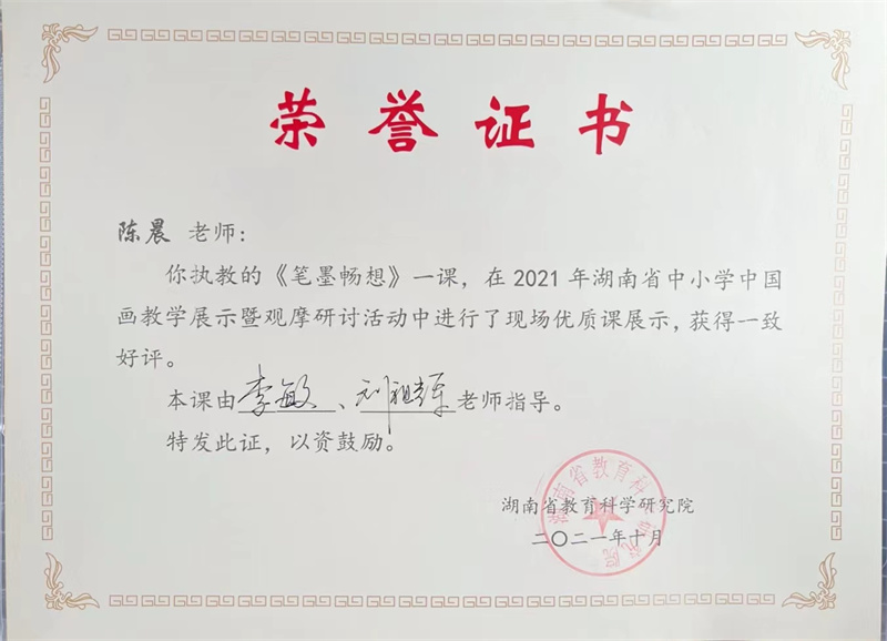 本网讯 进入12月以来,重磅喜讯接二连三,捷报频传,全体芙蓉人为之振奋不已。在刚结束的湖南省首届学生安全教育现场说课竞赛与湖南省中小学中国画教学展示暨观摩研讨课活动中,经过层层选拔,安化县第一芙蓉学校青年教师陈晨喜获两项大奖。 12月4日,在长沙市雅礼麓谷中学举行的2021年度全省学生安全教育教学现场竞赛中,陈晨老师精彩的课堂表现、丰富的安全教育知识获得了在场评委的一致好评,荣获省一等奖。 12月8日,陈晨老师在怀化市芷江县举行的湖南省中小学中国画教学展示暨观摩研讨活动中,代表益阳市参赛,所执教的《笔墨畅想》一课,被专家组评为“省级优质课”。 学校自开办以来,该校教学比赛频结硕果,这是学校先进的教育理念、鲜明的学科特色和教师精湛的教学水平的有力体现。学校将坚持把打造一支强有力的师资队伍为发展动力,以提升教育教学质量作为办学的重中之重,向学生、家长和社会交上一份满意的答卷。(通讯员 李韦奇 万扬)