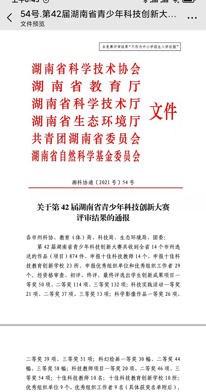 省科技创新大赛是由湖南省科学技术协会、湖南省教育厅等六家单位联合举办的省内最高级别比赛,至今已举办42届。