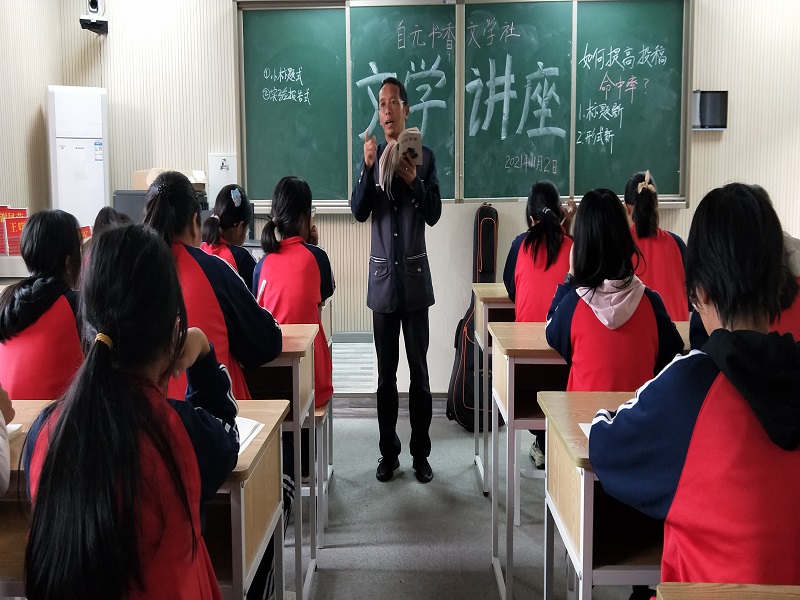 本网讯 11月2日下午,龙塘中学自元文学社举办了“书香与梦想齐飞,阅读与人生相伴”系列活动之“一路书香,一路成长”文学讲座。 为了落实上级“双减”精神,丰富学生课余生活,培养学生阅读及写作兴趣,提高习作能力,该校成立了以文学爱好者为主体,辐射全校的“自元书香文学社”。本次活动邀请了学校自元书香文学社的创始人兼主编蒋光华老师,对学生进行了创作与投稿的指导。蒋光华指出,要提高投稿命中率,要抓住一个“新”字。第一是“标题新”,俗话说“题好文一半”,一个好的标题才能吸引读者的眼球;第二是“形式新”,习作可以通过小标题式、实验报告式、书信式、就诊病例式、访谈录等多种多样的形式,给读者耳目一新的感觉;第三是“内容新”,内容新颖,与时俱进,富有时代气息,能推陈出新;第四是“语言新”,语言鲜活生动、幽默风趣、有血有肉......能够让读者感受到祖国语言文字的优美!