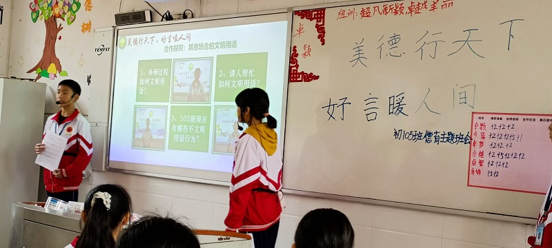 本网讯 “我们郑重承诺,从今天起,我们将告别污言秽语,持美德行天下,用美言暖人心,从我做起,做一个对社会有用的人!”10月19日第七节课,伴随着这一声声铿锵的誓言结束,孩子们庄重举起的右手随之放下。江英学校七年级《美德行天下,美言暖人心》主题德育课展示活动之同课异构课堂研讨告一段落。 本次同课异构德育活动课,七年级各班主任老师均有参与,且有105班和113班两位班主任老师蒋海波、任俊杰作为年级组代表进行展示,围绕他们典型课例与课堂结构展开研讨,旨在推动各班德育课堂科学、合理的构建、深入优化校本德育课的育人功能。 蒋海波老师的课堂充分展现了学生为主体、教师为主导的新课改理念,设计了丰富多彩的学生活动,如朗诵、分角色对话、情景表演、场景模拟等,围绕语言文明的重要性、文明语言的魅力与日常生活中文明语言的运用这些话题开展德育教育,六个小组的展示活动精彩纷呈。在针对如何改善班级不文明用语存在的现状时,数名孩子自由发言时提出用罚做值日和义务劳动等惩治不文明的方法,主持人趁机提出现场修订和完善班级班规的倡议,将课堂推向了一个小高潮。 任俊杰老师的课堂活动形式多样化,辩论、快板的引用活跃了课堂氛围,朗诵中的齐读、分组读、分角色读等形式凝聚了班级合力。她还侧重将生活中使用不文明语言解决矛盾的多个场景进行了真实的情景再现,发人深省。其中,任老师还引领学生对自我语言的不文明行为进行了深刻反思,孩子们积极发言,谈吐有度。校园26条禁语、文明礼仪10字规章重温,与全体同学的宣誓,充分为学生语言的规范奠定了基础。 本次活动的另一个大的特色就是年级组的评课,年级组长伍亭老师、德育课总负责人喻云怒书记、教务主任戴思妹以“目标明”“能力强”“活动实”“效果优”“形式活”五个关键词作为评课维度,对这两堂课进行了深入具体的点评,其他老师做了很好的补充。校长姚喜临在总结本次活动时,对参与学校德育工作的全体老师寄予期望:他把自己形象地比作一位班主任,他将带领全校两百多名学生(即该校教师)坚守立德树人的教育初心,奋力工作,创造辉煌;而各班主任引领学生开展德育课的目的是用习惯成就未来,用思想凝聚行动,树人之前先立德,全体老师应该牢牢把握德育铸魂、立德树人的主线,让学生成为社会主义现代化建设事业的新时代好少年。 据悉,江英学校在益阳市“十四五”教育科学规划课题工作中,以德育校本资源的开发与实践研究为主题的课题成功立项,此次德育课研讨活动的开展无疑将成为课题研讨路上的又一里程碑。该校一周一次的德育课堂也将成为学校德育工作中的突出亮点,其育人成果是十分显著的。(通讯员刘伍红 姚喜临 喻云怒)