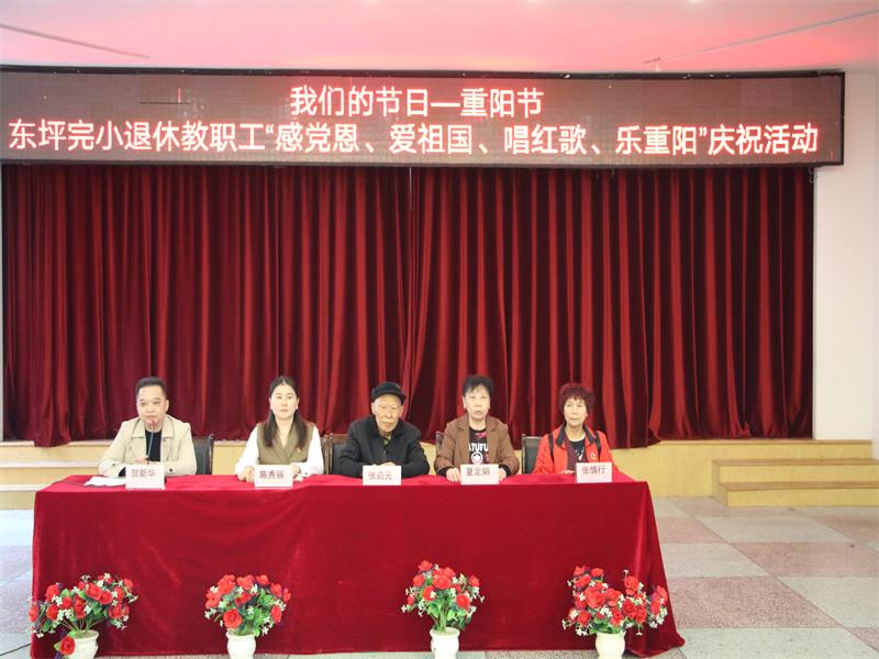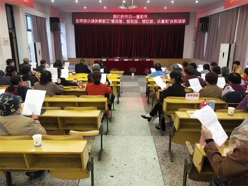 本网讯 10月14日下午,东坪完小退休教师齐聚六楼多功能厅,举行“感党恩、爱祖国、唱红歌、乐重阳”庆祝活动。 活动由该校工会主席贺新华主持,该校校长陈秀丽发表了热情洋溢地致辞,她对前来参加活动的退休教师表达了最真挚的祝福,对老师们多年来为学校发展所付出的努力和做出的贡献深表谢意,向老师们汇报了学校一年来所取得的各项成绩。中心学校退休协会主任张启元和该校退休教师组长夏定娟分别向老师们表达了节日的问候和美好的祝福,对学校领导表示了感谢,并希望我们的学校越办越好。 活动中,该校办公室主任谌学智带领全体退休老师学唱歌曲《我的祖国》,老师们积极参与,放声歌唱,仿佛又回到了当年的光辉岁月。 在欢乐的歌声中,本次重阳节活动圆满结束,退休教师罗腊梅高兴地说:“感谢学校组织这样的活动,让我们这群老伙伴重聚首,忆往昔,真是太开心了!”(通讯员 谌学智)