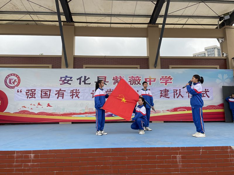本网讯 10月13日下午,在中国少年先锋队建队72周年的日子里,安化县紫薇中学举行“强国有我,请党放心”七年级少先队建队仪式。 伴随着少先队鼓号“出旗曲”,中国少年先锋队队旗缓缓进入会场,全体队员和辅导员向队旗敬礼。在全场齐唱中国少年先锋队队歌之后,校长曹文武宣读建队决定和任命名单,副校长李华集为大队辅导员颁发聘书;慷慨激昂的音乐响起,胸前飘扬着红领巾的中队辅导员们向各班中队长授中队旗,中队长们骄傲地挺起胸膛,目光坚定如炬,接过的是鲜红的中队旗,立下的是努力学习的誓言,扛起的是建设祖国的重担。接着,七年级433名少先队员佩戴鲜艳的队徽举起右拳大声宣誓,“我是中国少年先锋队队员,我在队旗下宣誓……” 随后,2101班谌佳妮同学代表全体少先队员发言,“让我们时刻准备着迎接新的挑战,创造新的辉煌……”,她的发言充分展现了紫薇少年们的朝气与力量,理想和意志。 不忘初心,牢记使命;强国有我,请党放心。这次活动增强了少先队员们对少先队组织的荣誉感和归属感,全体少先队员将在队旗的指引下,争做社会主义事业的建设者和接班人!(通讯员 肖静和 李晴)