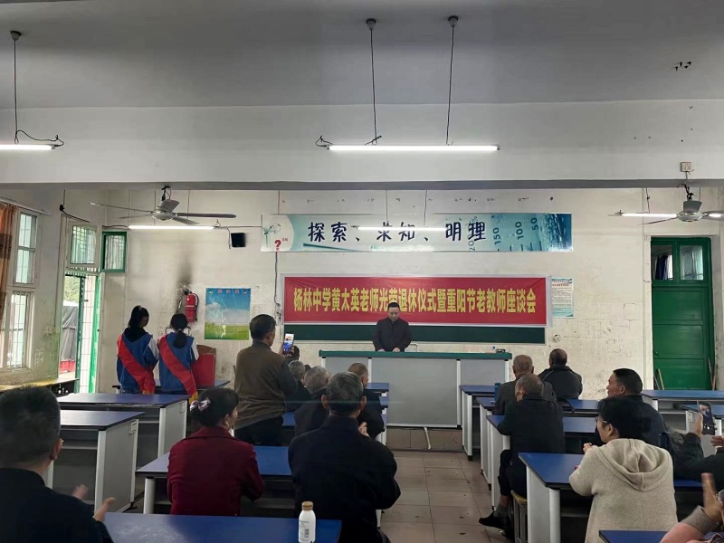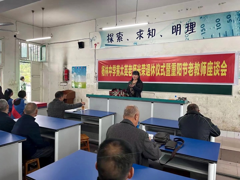 本网讯 10月11日上午,杨林中学为新退休教师黄太英老师举行退休仪式暨召开重阳节老教师座谈会。 再过两天就是中华民族的敬老尊老的节日——重阳节了,因学校要在13日至15日召开秋季运动会,所以重阳节的庆祝活动提前举行。 上午9点多,在安的10多位本校退休的老领导、老前辈陆续抵达学校,踏上这片熟悉的土地,他们欣喜地察看了正在紧张施工的学生公寓和校园发生的翻天覆地的变化,憧憬着学校美好的明天。 10时许,仪式和座谈会在物理实验室举行,工会主席欧阳跃科简短致辞后,邀请新退休教师黄太英老师上台,两名学生代表向黄老师敬献鲜花表示感谢,黄老师回顾了自己37年的工作历程,今日就要离开日夜辛勤耕耘的讲台和朝夕相处的学生、同事,她眼含泪水,几度哽咽,体现出一个老教育工作者对教育的独特情怀。谌更生校长向黄老师的光荣退休表示祝贺,对黄老师为学校教育的所做出的贡献表示感谢,向各位老教师提前祝他们节日快乐。谌更生向各位老教师汇报了学校的工作情况,特别是学校薄改提工程建设、今年中考又获丰收以及学校经费运转等一一作了介绍。并表示尽管学校经费困难,一定会保障老教师的“三节”慰问和重阳节活动的开展。退休协会会长程满意老校长叮嘱老教师们要与时俱进,勇于接受新事物。要学会怡情养性,调养身心,乐观开朗,笑看人生。并就老协有关工作做了具体安排。最后,欧阳跃科祝各位老领导、老教师老有所为、老有所乐,身体健康,阖家欢乐!(通讯员 欧阳跃科)