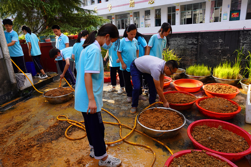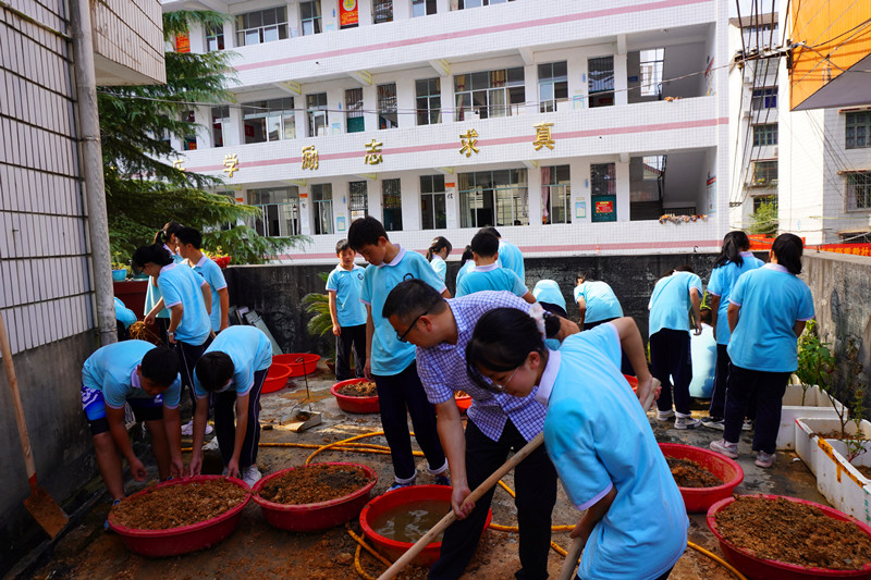 本网讯 梅城镇中学社会实践小组2021年上学期开始了“践行光盘行动,弘扬节俭美德”的实践活动。小组成员利用学校办公楼二楼空坪开辟了种植园,育种了秧苗,移植了水稻,培育了辣椒、茄子、菡菜等蔬菜。通过一个暑假的动手实践,学生真切感受到了培育过程的艰辛,懂得了食物来之不易,效果良好。 2021年下半期一开学,为了让更多学生明白光盘行动的意义,科技辅导员李凤鸣老师请示扩大园子规模,学校领导非常重视,组织召开了专题会议,下拨专项经费,购置了大量种菜用的锄头等劳动工具、农家肥、种子等必需品。9月15日,学校副校长戴彪、总务主任郭太清、办公室主任蒋志球、工会主席胡盛云等还亲临现场指导新参加活动的学生动手劳作。郭泰清还动员说,如果同学们能通过此次活动养成节约的良好习惯,从不浪费一粒粮食,延伸到不浪费一张纸,一滴水,那无论是对同学们行为习惯的养成,还是缓解学校的财务压力,作用都是不可估量的,现在学校每月的水电费都是一个不小的数字,浪费惊人。科技活动小组的这个主题活动有很强的现实意义,学校大力支持,财政再困难都会保证学生活动的正常开展。 活动过程中,小组成员们将原来从外地运来的泥土装进盆里,装满了15个盆子,因为土有粘性,铲土很辛苦,很多同学鞋子弄得很脏;然后,小组成员给部分盆子种上了大蒜、葱、萝卜等季节性蔬菜。随后,又清理了走道等地留下的垃圾泥土等,经过三小时的努力,整个种植园面貌焕然一新! 劳动结束后,科技辅导员李凤鸣总结说,我们今天只是感受一下劳动的艰辛,所做的工作仅仅相对于平时的松土,播种,真正种植粮食蔬菜还要施肥、除草、采摘,稻谷还要收割晒干加工,辛苦许多倍;现在我国还要进口大量黄豆大米等农产品,可见倡导光盘行动的必要性。 活动结束后,同学们纷纷表示,就是这样的一劳动过程都那么辛苦,食物真的来之不易,自己以后一定要真正践行光盘行动,养成勤俭节约的好习惯!(通讯员:戴彪 郭泰清 蒋志球)
