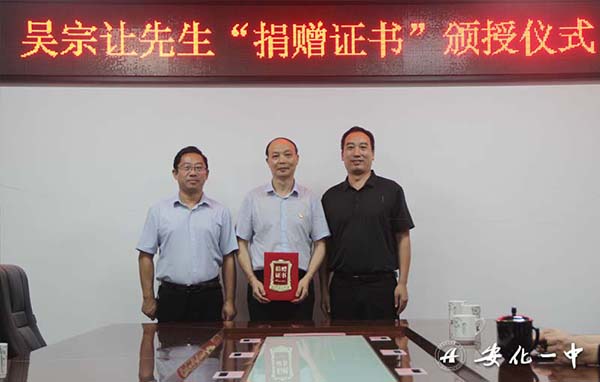 本网讯 8月18日上午,安化一中学校图书馆二楼举行吴宗让先生“捐赠证书”颁授仪式。学校党委书记、校长李远喜,原党委书记、校长李拥军,党委副书记、副校长吴炜,副校长曹迎新,党委副书记、纪检监察周兆华等领导出席会议,会议由原常务副校长易柱清主持,据了解,吴宗让先生2020年上学期为学校捐赠8棵罗汉松(价值25万元)。