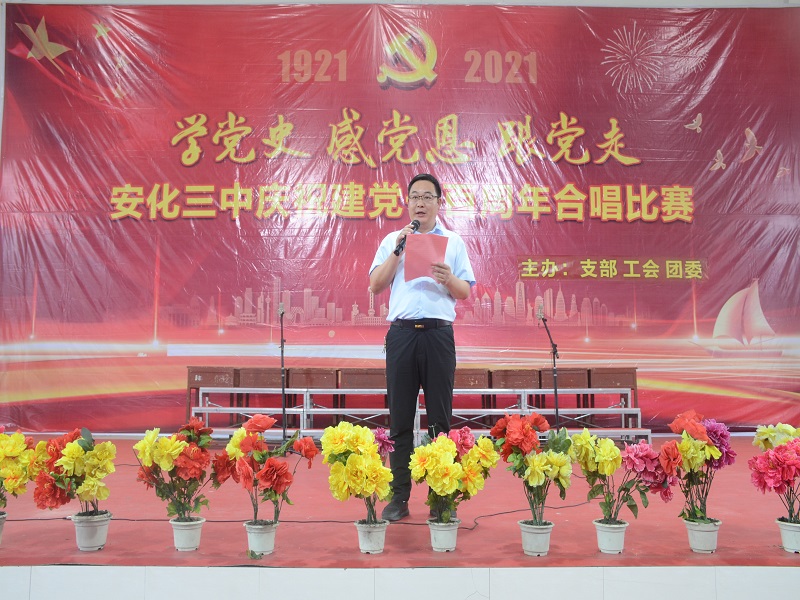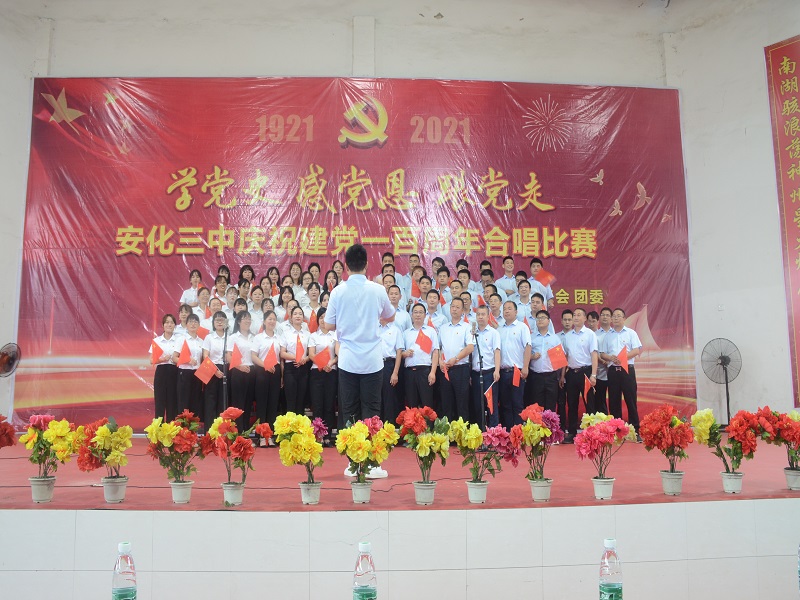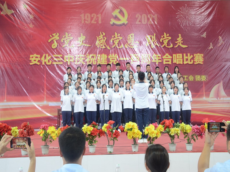 本网讯 7月1日下午3点,为庆祝建党100周年,安化三中全体师生齐聚风雨球场,参加以“学党史、感党恩、跟党走”为主题的大型合唱比赛活动。此次活动由安化三中党支部、工会、团委主办,全体师生共同参与,一齐歌颂中国共产党的伟大历程和丰功伟绩,培养爱党爱国情怀。 活动伊始,全体师生共同唱起《没有共产党就没有新中国》,氛围热烈,歌声随着红旗飘扬,传遍校园的每一个角落。随后由全体老师带来合唱《社会主义好》,讴歌我们伟大的党,伟大的社会主义。紧接着,作为学校的主体,我们优秀的同学们也在热烈的气氛中带来了准备已久的节目,《黄河大合唱》《歌唱祖国》《强军战歌》······一首首或婉转悠扬、或激情澎湃的歌曲不断地征服着听众,会场掌声迭起,活动直接到达了高潮。同时,教师们将精心准备的节目穿插其中,笛子独奏、独舞、歌曲串烧······不断掀起热浪,精彩纷呈。 活动最后,学校为获奖班级颁奖,同时也为“学党史,感党恩,跟党走”历史知识竞赛和征文比赛获奖同学颁奖表彰。本次活动通过生动活泛的合唱比赛,让师生同唱爱党爱国旋律,激发师生的爱党爱国热情,增强实现中华民族伟大复兴的使命感和责任感。