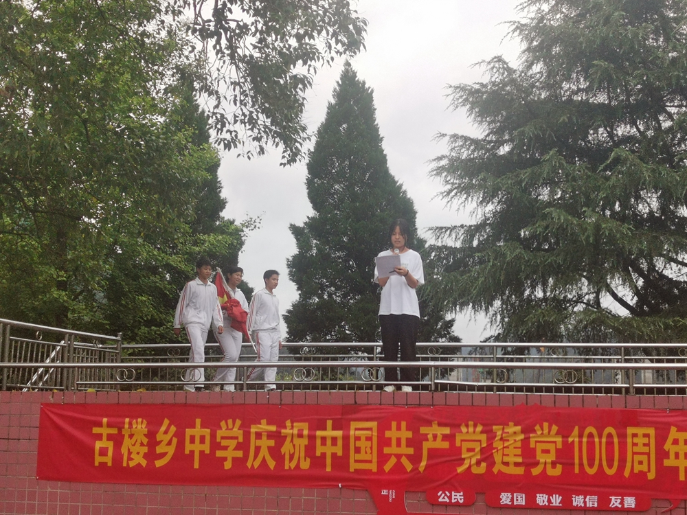 本网讯 7月1日是中国共产党一百周年华诞纪念日。由于这一天一直下雨,直到下午四点,在庄严肃穆的《国际歌》声中才隆重拉开序幕。但古楼中学全校师生热切期待七一升旗仪式的隆重举行的热情丝毫不减。 古楼中学118班负责升旗仪式。 随着五星红旗的冉冉升起,同学们激情歌唱《义勇军进行曲》和《没有共产党就没有新中国》。激昂、嘹亮的歌声回荡久久在校园。在《生于华夏、见证百年》的国旗下讲话中118班陆雨晴表达了“生于红旗下、长在春风里”的青年一代“何其有幸生于华夏,见证国家在波澜壮阔的历史进程中不断壮大”。 在《中国共产党永远是中国最广大人民利益的忠实代表》的致辞中学校德育夏习文主任介绍了中国共产党领导中国人民取得新民主主义革命及社会主义革命胜利历史;阐述了中国共产党领导中国人民建立独立自主国民经济体系实现工业化、实现民族复兴的进程中取得辉煌成就的历史;强调在当今复杂的国际、国内形势中,拥护中国共产党的领导尤为重要,“人民有信仰、国家有力量”;拥护中国共产党的领导既是每一个青年学生权利也是义不容辞的历史责任与义务。希望同学们在信仰上、在行动中自觉和党中央保持一致、积极融入国家发展的大势,为国家的富强、民族的复兴添砖加瓦。 据悉,学校还计划于下一周周会课上组织学生观看习主席在庆祝中国共产党建党100周年大会上的讲话。(通讯员:檄文) |