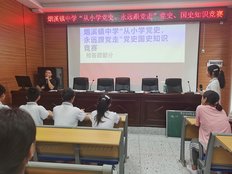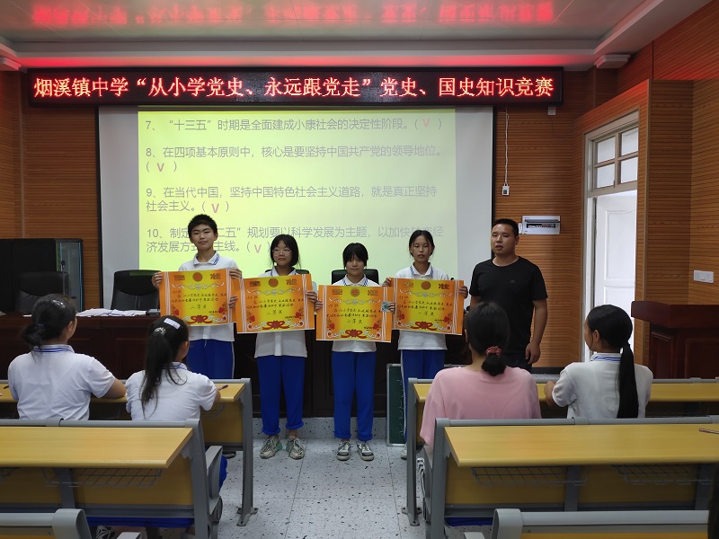 本网讯 “没有共产党,就没有新中国,共产党辛劳为民族,共产党他一心救中国”伴随着嘹亮的红歌声,烟溪镇中学庆祝建党一百周年系列活动拉开序幕。为进一步激发全体学生的爱国、爱党热情,讴歌光荣的中国共产党,7月1日,恰值建党一百周年之际,在该校政教处组织下,全体师生有序开展庆祝建党一百周年系列活动。 早自习时间,全体学生庄严肃立,奏唱国歌及《没有共产党,就没有新中国》,铿锵的歌声响彻校园,传递着学子们的殷殷爱国情,办公室主任刘雪姣向大家讲党史,深情回顾了共产党的峥嵘岁月,希望全体学生从党史中坚定共产主义信念,传递红色基因,延续共产党人的精神血脉。下午第七八节课,在政教处及团委组织下,开展了精彩的党史、国史知识竞赛,每班选拔五名学生参赛,通过笔试、抢答等方式开展比赛,最终179班荣获竞赛一等奖。 “我骄傲,我是中国人,我将把共产党的光荣传统继承下去,为国家、为社会奉献力量”,党史竞赛结束之后,一位学生激动地说道。学校也将以此次活动为契机,继续开展多样的主题教育活动,引导学生们知党恩、跟党走,做新时代好青年。