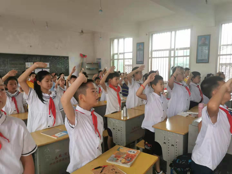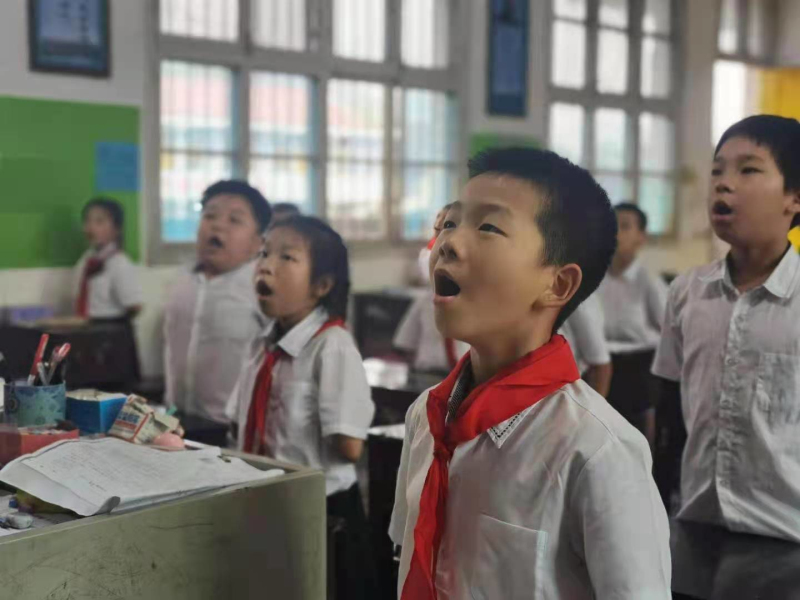 上午8点35分,山口完小全体师生各个精神饱满,神态庄严,在义勇军进行曲的伴奏下,唱着中华人民共和国国歌,注视着五星红旗缓缓升起。