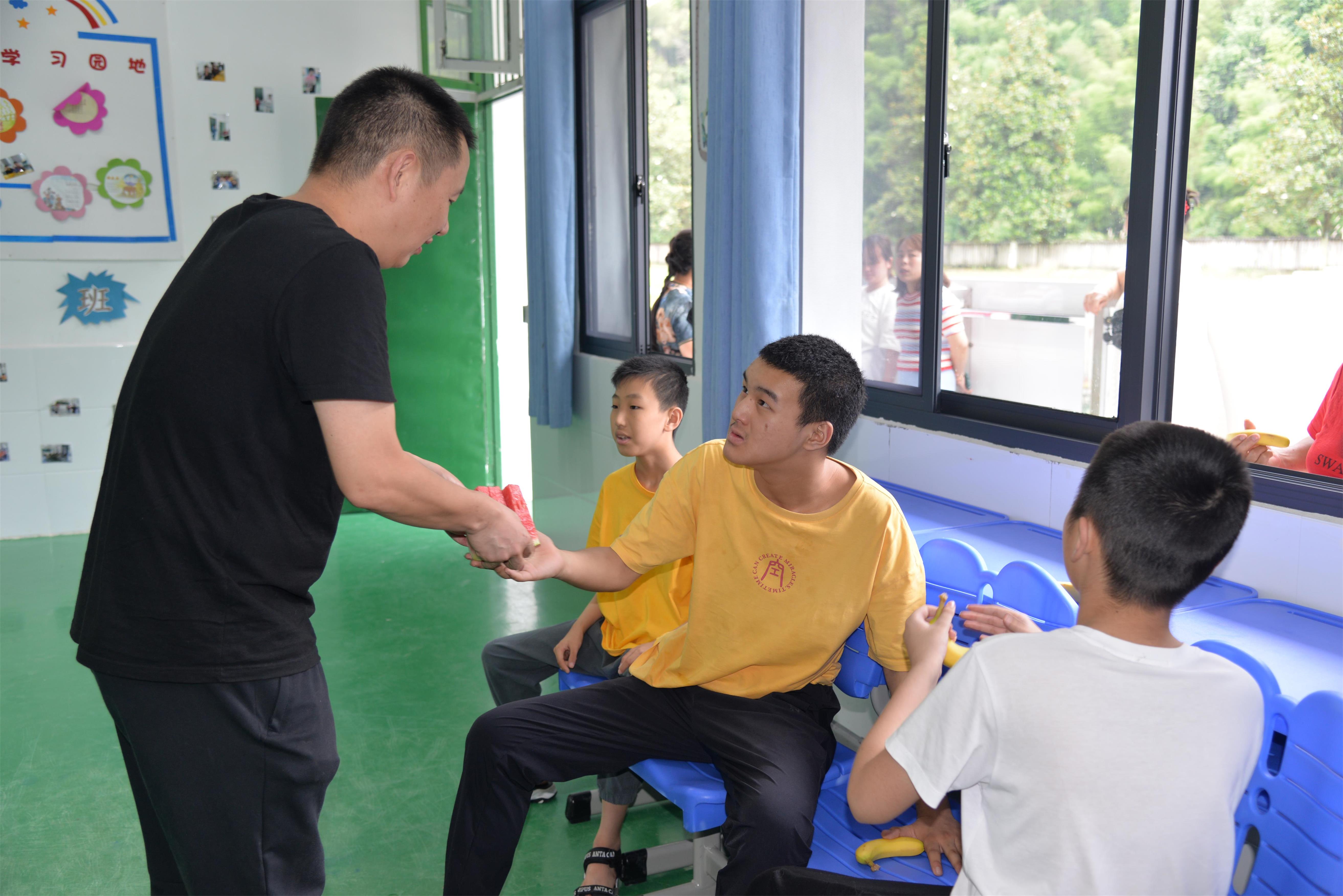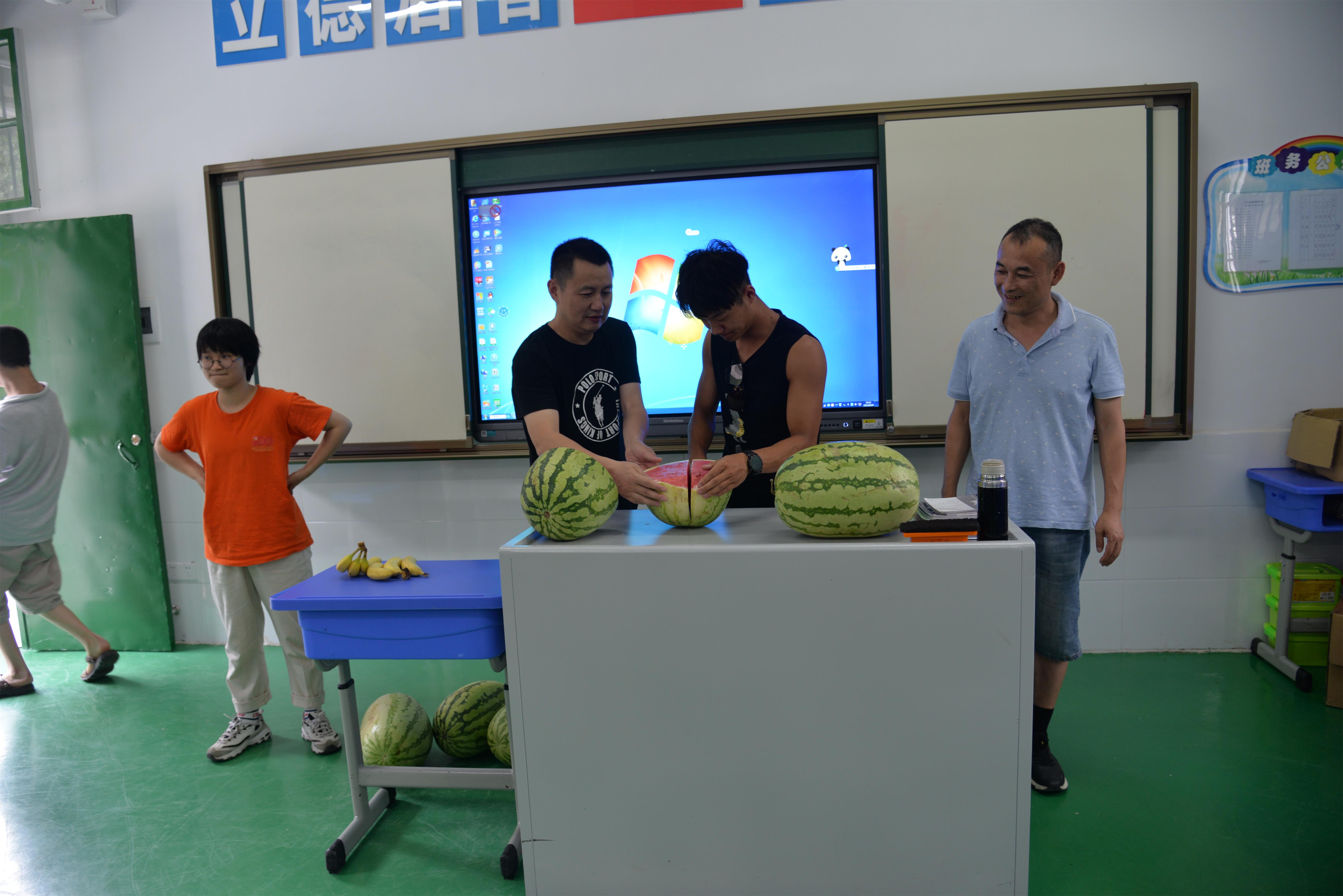本网讯 6月25日下午,人社局工伤保险中心主任王翔与两位麦田志愿者来校看望学生,为孩子们送上了解暑的西瓜。