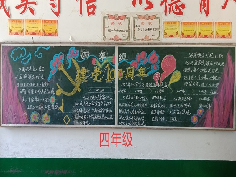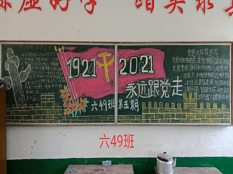 本网讯 回顾党的奋斗历史,促进学生铭记红色历史、追寻红色足迹、传承红色基因,争做新时代好队员。清塘铺镇回春完小以党史学习教育为载体,深入开展为期2周的“庆祝建党100周年”黑板报评优活动。 活动启动以来,各中队积极参加,学生在老师指导下,通过上网收集党史资料,中队辅导员宣传党史活动,认真学习党的发展史和奋斗史,了解中国共产党诞生、发展、壮大的艰难历程,构思别出心裁、设计不拘一格、内容丰富多彩,用粉笔深情回顾了共产党的奋斗历史,热情讴歌了中国共产党实现中华民族伟大复兴中国梦的奋斗历程,字里行间充分流露出对党的无比热爱和崇敬之情,向建党100周年献上了一份厚礼。 经评委们认真评选,有四年级、六49班获得一等奖。(通讯员 杨合坤)