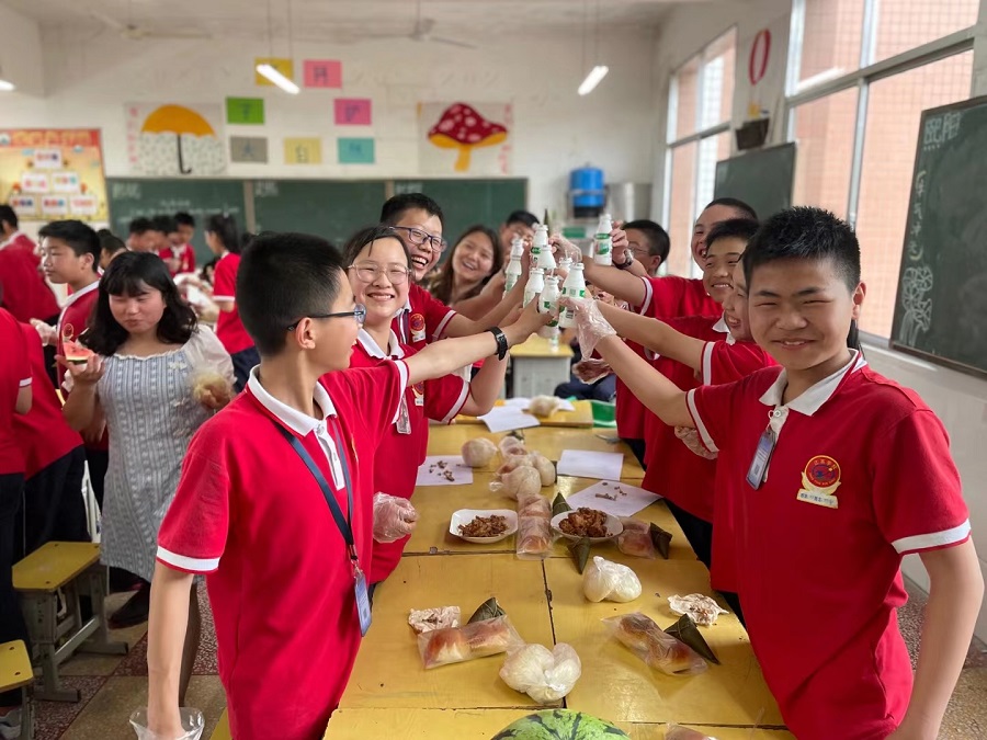 本网讯 四时花竞巧,学子粽争香。6月14日,适逢端午,江英学子在学校也欢度佳节。尤其是八九年级毕业班学子,在中考前夕品尝着美味,一扫考前的紧张,露出了幸福的笑容。 江英学校近七成是留守儿童。“独在异乡为异客,每逢佳节倍思亲。”该校每逢传统节日,都会为孩子们营造浓浓的节日氛围。今天小学部许多班级到“开心农场”摘回了亲手种的黄瓜、辣椒、茄子等蔬菜,生活老师为孩子们烹制了美味佳肴并带领孩子们制作了各色可爱的粽子。中学部特别令人感到温馨的是九年级毕业班的11位班主任,为孩子们准备了粽子、西瓜、鸡腿等花样新颖的美味让孩子们感受到了班集体的暖意。尤其是九年级83班,班主任戴思妹老师把粽子系上红丝带悬挂在门梁上,每个孩子用头“顶”粽子,寄寓着中考“高中”的美好寓意。满满的仪式感里,孩子们幸福的笑容格外甜蜜。 江英学校以“成就独特的每一个”为教学理念。该校九年一贯制的办学体制让学生们从小就养成良好的行为习惯。小62班海波的家长为全班孩子送来了粽子和水果。他激动地说:“孩子来江英不到两年,从厌学到好学,从沉迷电视、手机,到喜欢阅读、交流,这些惊人的变化,离不开老师的引导,更离不开学校对学生全方位的培养。”中学部各班的家长微信群中对学校、老师的感谢和对学子们的中考祝福不断地刷屏。 该校理事长谢仁和一直倡导的办有温度的教育,已经在这片沃土上落地生根。在这个美味飘香的日子里,我们祝福莘莘学子金榜题名,人人高中!(通讯员 刘艳 蒋海波)