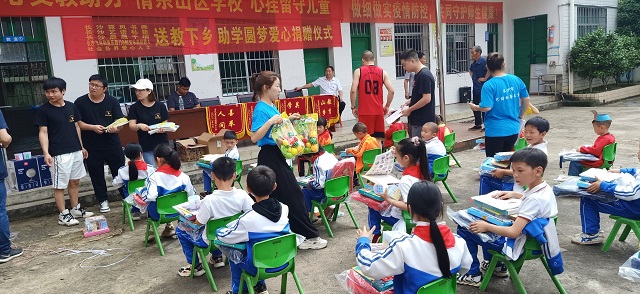 本网讯 6月2日,乐安镇团云教学点举行“送教下乡.助学圆梦”爱心捐赠活动,驻团云村乡村振兴工作队第一书记喻正意、村支书夏利琴、乐安镇完小校长胡斐参加了此次捐赠活动。。 六一刚过,同学们还沉浸在节日的氛围中,来自长沙艺语私塾、长沙霓风书画、长沙鼎晟千瑞文化传播有限公司、长沙飞鸟和鱼乐器行、酷宝乐高机器人等爱心人士给团云教学点的孩子们送来了音乐、英语、美术、机器人等四门精彩课堂,同时也为学校捐赠了电子显示屏、学习用品、玩具,共计人民币一万多元。 同学们从爱心人士手中接过书包、学习用品、玩具,脸上露出了灿烂的笑容,有的学生随口说道“哇!还有呀!这么多我都快拿不下了!” 教学点负责人彭本志老师在这里辛勤耕耘了三十几年,见证了团云教学点的成长过程,他语重心长的说“感谢上级部门、村委、爱心人士的关注与帮助,正是有了他们,团云小学各方面得到改善,同时也希望孩子们懂得感恩,好好学习,天天向上,做共产主义的接班人。” 最后,所有人合影留念,记录下了这美好的时刻。