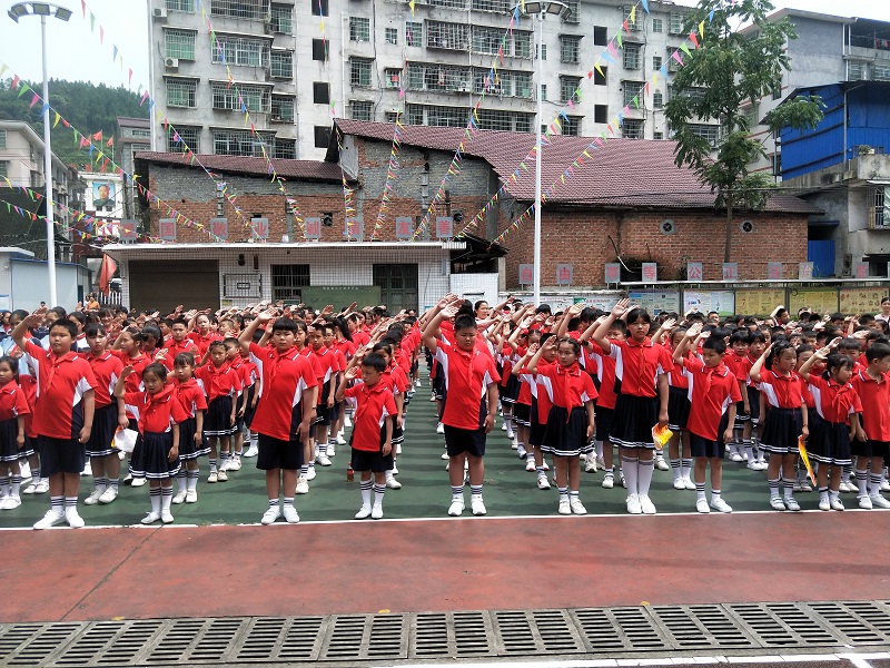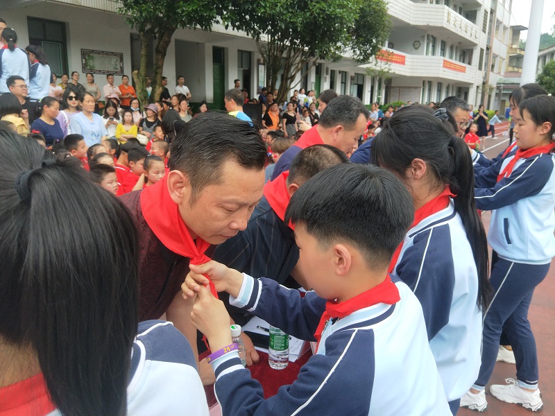上午10:00,伴随着熟悉的出旗曲,迎来了象征着光荣的旗帜——中国少年先锋队队旗。少先队员敬队礼,其他同学行注目礼。在庄严的出旗仪式后,少先队辅导员刘黍芃老师宣读了新队员名单,184名表现优秀的同学加入了少先队组织。 在《中国少年先锋队队歌》的旋律声中,老队员给新队员授戴好鲜艳的红领巾。新队员们个个精神饱满、信心满怀,从他们的稚嫩的脸上看到了对共产主义的坚定信心和祖国未来的希望。114班刘欣悦同学代表新队员表达了加入少先队的骄傲与自豪。校长刘芬代表全体师生表达了对新队员的祝福和全体少先队员的殷切期望。最后,在刘黍芃老师的带领下,全体少先队员进行了呼号,队员们在心灵上感受了先进力量的无上光荣与自豪,时刻准备着为伟大的共产主义事业贡献一切力量。