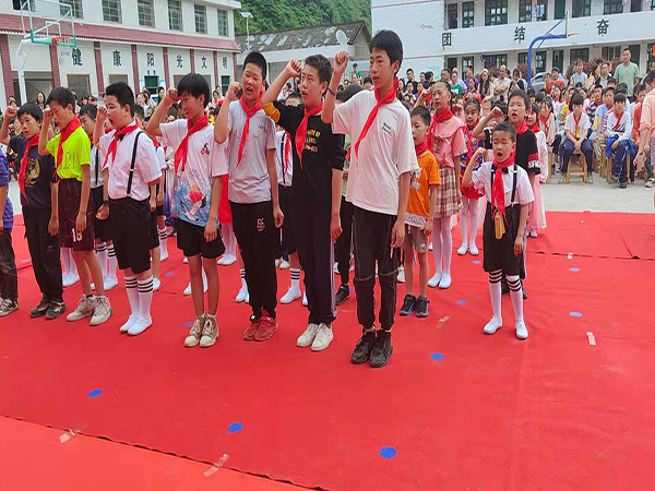 本网讯 6月1日是一年一度的儿童节,高明铺完小全体师生齐聚操场,欢庆六一。 此次庆典活动分为两个部分:新少先队员入队仪式、欢庆六一节目表演。 在少先队大队辅导员廖慧敏老师的主持下,62名同学光荣地加入了少年先锋队。新少先队员代表阙嘉宣发言说,自己成为少先队员是无比骄傲的,她将珍惜胸前佩戴的鲜艳的红领巾,时刻严格要求自己。优秀少先队员阙佳琪的发言中,不仅表达了对少先队员的殷切期望,而且还是表达了老队员们应该要对所有的新队员起到先锋模范作用。