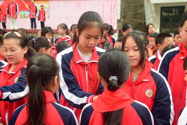 本网讯 5月31日上午,乐安镇完小全体师生齐聚操场,隆重举行2021年“红领巾心向党”入队仪式。 在雄壮的国歌声中,拉开了入队仪式的序幕,同学们身着统一的服装,老少先队员胸前佩戴着鲜艳的红领巾,个个脸上洋溢着节日的喜悦。 出队旗、唱队歌、老少先队员给新队员佩戴红领巾,少先队大队辅导员吴学敏老师宣布新少先队员名单,带领新队员庄严宣誓“我是中国少年先锋队队员,我在队旗下庄严宣誓,我热爱中国共产党,热爱祖国......”队员们铿锵有力的宣誓,坚定了他们加入中国少年先锋队的决心。 一年级新队员姚思韵代表全体新队员宣誓,在今后的学习生活中,坚持佩戴红领巾,像爱护自己的眼睛一样的爱护红领巾,处处以一名少先队员的标准来严格要求自己。 最后,该校校长胡斐寄语“祝贺121名同学加入少先队组织,成为了一名光荣的少先队员,希望全体少先队员起到榜样的作用,好好学习,天天向上,为共产主义事业而奋斗。”