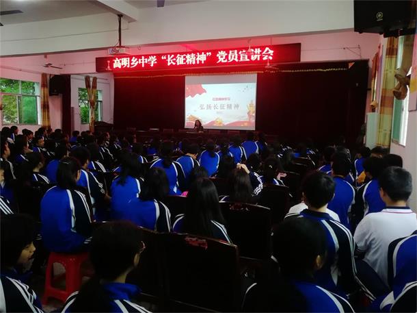本网讯 5月26日晚上,面向全体师生的“长征精神”党员宣讲会在高明乡中学举行。 据了解,为庆祝党的百年华诞,并以此为契机,高明乡中学举办了一系列“学党史、跟党走”活动,让师生传承红色基因,成长为红色接班人。学校根据《学党史活动计划》,部署了党员教师红色宣讲会。今晚宣讲的主题是“弘扬长征精神”,由青年党员教师王艳霞担任主讲。 18点整,宣讲会在师生《没有共产党就没有新中国》和《十送红军》的深情合唱中拉开序幕。王艳霞老师的讲座围绕“什么是长征”“为什么要长征”“长征遇到的困难”“长征的历史意义”“长征有哪些值得我们学习的精神”依次展开。她的讲座声情并茂,娓娓动听,列举了大量史实,尤其详细讲解了红军长征过安化的历史故事和资料。全堂听众被她的讲座深深打动,时而热泪盈眶,时而报以经久不息的掌声。学生代表胡馨尹在总结发言中说:“王老师两个半小时的讲座,对我来说,是一次红色思想灵魂的洗礼,激励我继承革命传统,刻苦求学,努力成为优秀的红色接班人。” 最后,宣讲会在师生《歌唱祖国》的嘹亮歌声中圆满结束。 (通讯员 高飞跃)