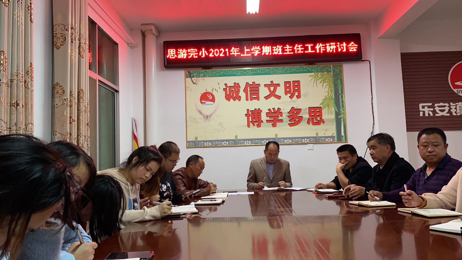 本网讯 5月19日晚,乐安镇思游完小召开了以班级常规管理为主题的班主任研讨会,学校行政及12位班主任参加会议,该校教导主任夏胜军主持会议。 研讨会首先由每位班主任老师就自己的班级情况和自己的班级常规管理作分享发言,他们有的畅谈学生习惯的培养,有的细数班干部的选举和培养,有的阐述良好班风的建设,向在座的老师们传经送宝。 随后该校教导主任作了关于班主任工作的专题报告。他在报告中道出了班主任工作现状并对该校班主任工作提了一些具体的建议。总务主任肖明,安全专干熊坚强就班级财物管理,学生安全的要求向班主任做了强调。 最后校长周正才做了总结发言,他对每个班主任的发言一一进行了点评,肯定了班主任工作中的亮点,也对班主任老师提出了几点期望,希望班主任管理要更细,刚柔并进,力争把班主任工作做得更好。 |