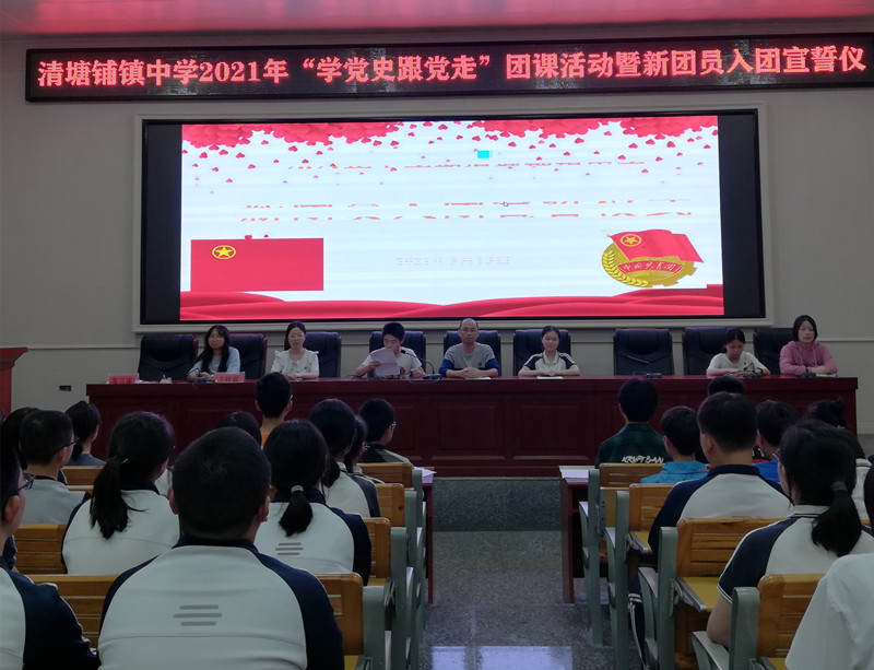 本网讯 5月13日晚,清塘铺镇中学团委在学校多功能报告厅举行“学党史、感党恩、跟党走”团课活动暨2021年新团员入团宣誓仪式。各班团支部书记、老团员、新团员共130余人参加。仪式由团委副书记刘婉如同学主持。 团委张剑文老师主讲了团课“学党史、感党恩、跟党走”,他从习近平总书记关于党史学习教育的重要讲话精神入手,同广大团员一起回顾了中国共产党的诞生、经历、发展的三个发展阶段,通过列举改革开放以来中国取得的巨大成就、脱贫攻坚取得的伟大胜利、新冠疫情防控取得的显著成效,让同学们深入领会党史精髓----学史明理、学史增信、学史崇德、学史力行。他希望团员青年作为党的助手和后备军,要团结带领身边的广大学生,全面认识历史,筑牢信仰之基,坚定责任担当,让红色基因薪火相传,把强国使命勇担在肩。 入团仪式上,全体师生肃立,齐唱国歌,团委张剑文老师宣布了新团员名单,近百名新团员面向鲜艳的团旗进行庄严宣誓,表达了大家对共青团组织的无限向往和为团旗、团微增光添彩的激情。张剑文希望,每个团员同学从佩戴上团徽这一刻起,就要认清自己肩负的责任,努力履行团员义务,用实际行动来表明自己无愧于“共青团员”这个光荣的称号。(通讯员:张剑文)
