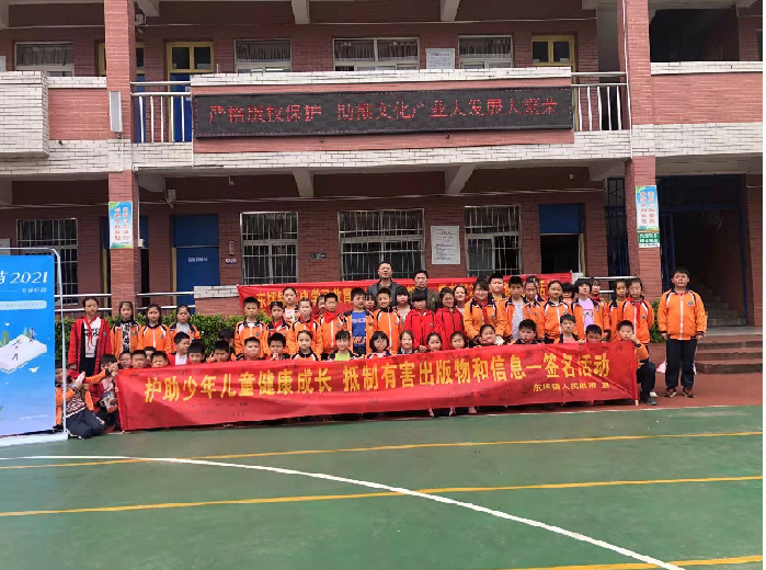 本网讯 4月22日下午,东坪镇党史学习教育宣传会暨“护苗•绿色签2021”进校园活动在东坪镇泥埠桥完小举行。 活动中,东坪镇政府干部贺敏首先为同学们解读了什么是盗版刊物和如何鉴别盗版物;随后镇政府干部谌兰宣读了“护苗•绿色签2021”倡议书,听完两位干部的宣讲和倡议后,同学们在“互助少年儿童健康成长,抵制有害刊物和信息”的大横幅上踊跃签名,纷纷表示要积极行动起来,拒绝盗版,从我做起,自觉抵制有害出版物和信息的侵蚀,购买正版的学习书籍和资料。 此次活动的开展,同学们鉴别和抵制盗版物有了全新的认识。