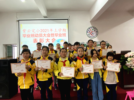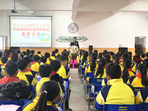 本网讯 4月8日下午,由紫云完小校长室、教导处牵头召开了毕业班学生动员大会暨表彰大会。 会议开始,贺勇校长希望全体学生有效学习,多做实事,做脚踏实地的“勤牛”,做身心健康的“小蛮牛”,做爱校爱国、有责任担当的“红牛”!教务主任夏艳平重点分析了上学期期末统考中六年级的成绩数据,并对优秀学生代表进行表扬表彰,对暂时落后或者退步的学生进行了提醒和鞭策!希望同学们对照成绩找差距,希望老师们分析原因再尽力,共创佳绩! 四位学生代表表达了对老师们教育栽培的无比感恩,并分享了切实可行的学习方法。毕业班教师代表肖俊寄语全体毕业生,希望孩子们珍惜最后三个月的小学时光, 鼓起信心 ,鼓足干劲, 向母校交上一份理想的答卷 ,为自己的小学生活画上一个精彩的“!”。六3班陶思颖的妈妈则向与会家长介绍了自己的育人经验,也表达了家长们感谢学校、感谢老师的心声。政教主任贺小琴和孩子们一起回忆小学阶段美好的时光,激励全体学生要以更加饱满的学习热情,更加踏实的学习作风迎接新的挑战! 最后,全体毕业生庄严宣誓,誓词铿锵有力,展现出紫云学子昂扬的斗志,把大会气氛推向了高潮!怀着对未来的憧憬与向往,愿每位毕业生都能为美好的明天而拼搏奋斗! 勤奋正当时,努力在当下。未来可期,一起加油!(通讯员 夏艳平 陶明君)