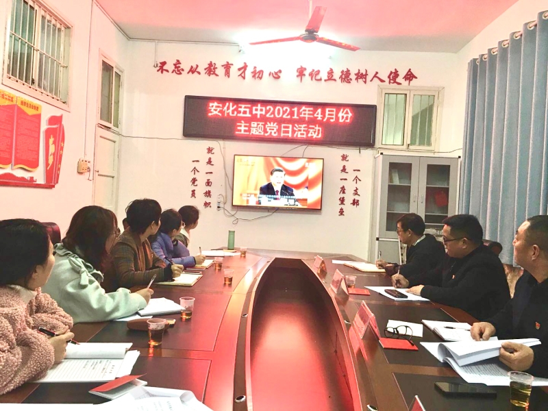 本网讯 4月7日晚,安化五中党支部书记、校长龚加宜组织开展了四月份主题党日活动,安化五中全体党员参与了本次活动。