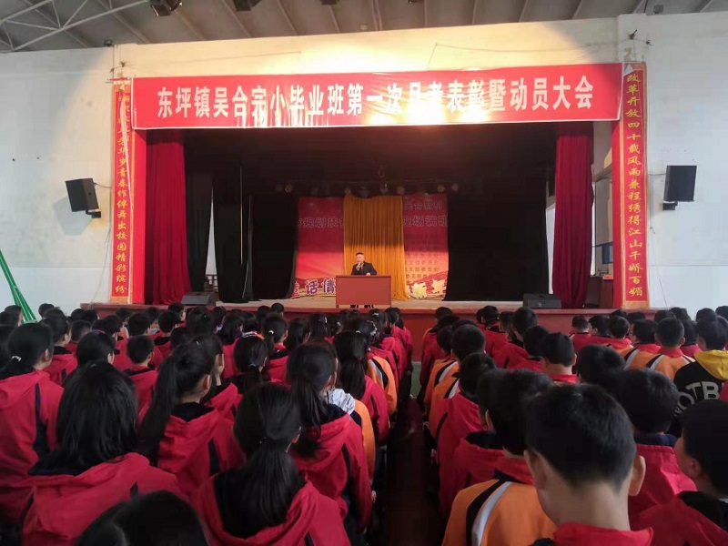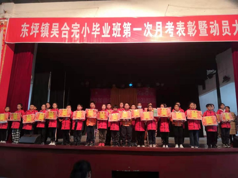 本网讯 4月6日下午,东坪镇吴合完小如期举行毕业班第一次月考表彰暨动员大会。 本次大会上,该校六年级全体师生齐聚风雨球场,每班派出一名学生代表,认真地总结了本学期的第一个月的学习情况,并对本次月考情况做了深刻的反思;教师代表柳叶老师则是针对为什么要努力学习,对学生进行谆谆教导,并热烈地与孩子们进行互动,鼓励他们学习取得更大的进步;之后,由该校校长伍益发言,他在报告中告诉孩子们:一定要学会有计划地学习,并告诉孩子们要如何做好学习计划,他还告诉孩子们要学会做好反思,针对自己的弱项,定好目标,然后去实施,同时,他还语重心长地告诉孩子们:人生路要靠自己走,学习要靠自己下功夫,去领悟,最后,他希望孩子们能够勤学好问,这样学习的效果会更好!接下来,学校对第一次月考中取得优异成绩的孩子和获得进步奖的孩子颁奖,顿时场上、场下一片欢腾与喜悦,最后,孩子们在铿锵有力的宣誓中结束本次的动员大会! 会后,各班又在班主任的组织下,对本班在第一个月的学习与成绩做了总结,据悉,1503班蒋博杰的妈妈也参加了此次班级表彰,她非常开心地说;“这种奖励是非常有效的,我相信孩子们的成绩一定会提上去,会越考越好的。” (通讯员:刘喆)
