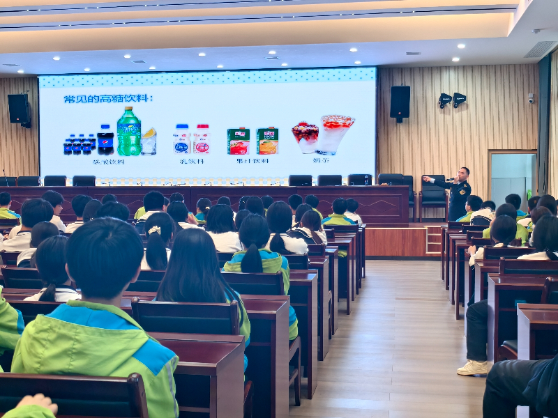 刘建美主任以生动有趣的授课方式,紧贴日常的图文课件,深入浅出地向在座的同学们重点讲解了三个方面的食品安全知识,一是解读中国居民平衡膳食宝塔,强调了合理膳食、健康饮食的重要性;二是通过实物展示,教同学们辨别“高盐、高糖、高脂”食品,学会识别食品的生产日期、保质期、保存及鉴别假劣食品的方法,倡导学生养成良好食品卫生安全习惯,自觉抵制校园周边无证照经营流动摊贩,增强食品安全辨识能力;三是播放“吸烟入肺”的实验视频,让同学们更直观地感受到吸烟带来的危害。