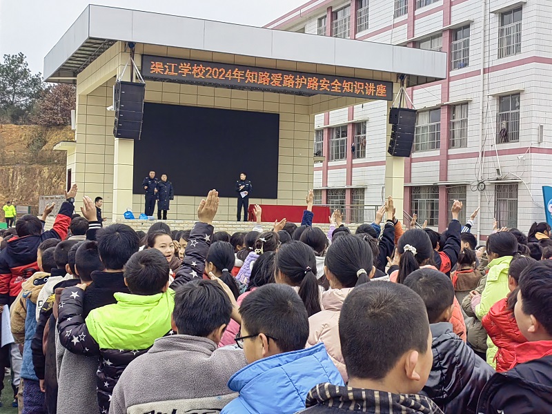 本网讯 1月12日,渠江镇派出所所长汤为、铁路派出所民警李意隆、铁路车站站长李麟等一行人来到该校,为学生们举办了“知路爱路护路”安全知识讲座。