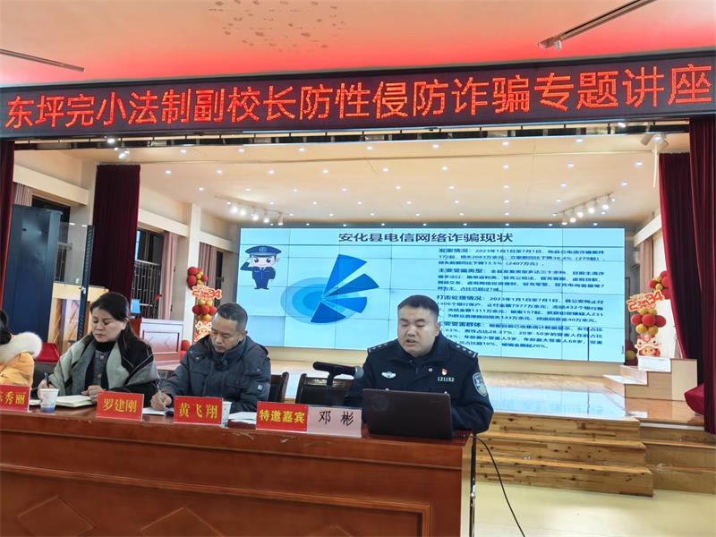 本网讯 元月2日晚,东坪镇完小全体教职工齐聚六楼东风讲坛,召开“利剑护蕾·雷霆行动”专项工作部署会议,东坪镇派出所副所长、法治副校长邓彬应邀参加。 会上,邓彬通过典型的校园性侵、电信网络诈骗案例,深入浅出地讲解了防性侵、防诈骗等知识,提醒老师们要加强防范,提高警惕,严于律己;要增强电信网络诈骗辨别力,不贪心、不逐利,擦亮双眼,用实际行动抵制校园性侵害、电信网络诈骗等,维护全校师生的合法权益。 该校安全办主任方兴组织全体老师学习了《东坪完小“利剑护蕾·雷霆行动”实施方案》,宣布成立东坪完小“利剑护蕾·雷霆行动”工作领导小组,明确小组成员职责。他结合该校实际,就如何深入开展“利剑护蕾”专项整治作出了具体的工作部署,紧接着带领全体教师观看防性侵警示教育片,进行专项教育活动,全面提高教师思想水平。 该校党支部书记、校长陈秀丽做总结发言,她指出,安全重于泰山,临近期末,每位老师需进一步加强学生的各类安全教育工作,把未成年人保护、交通安全、消防安全、疾病防控等作为安全教育重点,切实增强学生安全防范意识,确保学生健康成长。 会后,陈秀丽、邓彬组织该校全体男教师进行谈心谈话,进一步强调了校园防性侵工作。